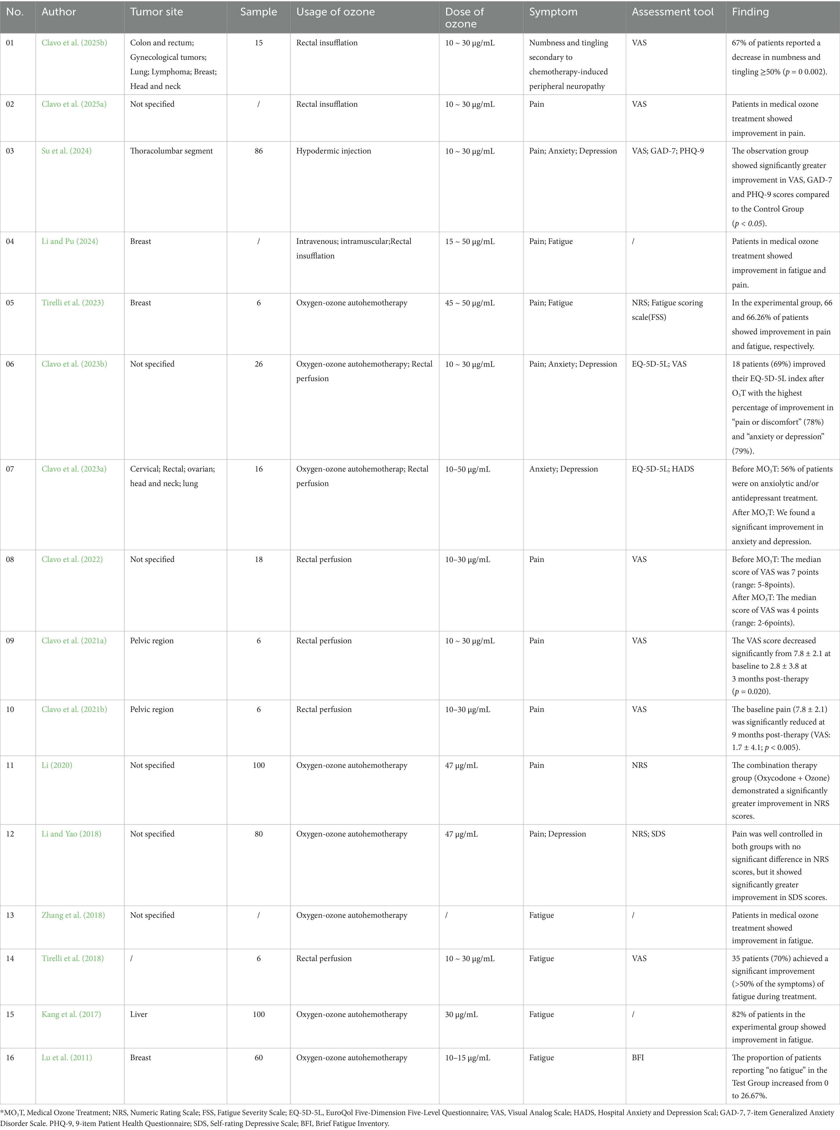 Results: A total of 16 articles were included to analyze and integrate the use of medical ozone, medical ozone dose, symptom assessment tools, and symptom management.