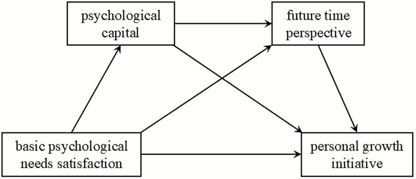 Previous research indicates that individuals with higher psychological capital demonstrate greater confidence and are more proactive in perceiving, planning, and shaping their future, thereby significantly enhancing their future time perspective (Elrehail et al., 2021; Schelleman-Offermans and Massar, 2020). Psychological capital, as a positive psychological resource, can effectively enhance individuals’ proactiveness in the face of adversity and encourage them to actively anticipate the future (Abubakar et al., 2019; Song et al., 2021). Specifically, individuals with high self-efficacy hold positive assessments of their own capabilities and view future problems as solvable challenges. Optimism guides individuals to attribute future events positively, interpreting setbacks as temporary and surmountable while maintaining confidence that their efforts will bring positive results. Hope prompts individuals to establish longer-term goals and actively identify effective pathways to attain them. Resilience enables individuals to recover quickly, adapt effectively, and persistently progress when confronting future adversities and challenges (Luthans and Youssef-Morgan, 2017). Psychological capital can significantly and positively predict positive future expectations. Positive future expectations refer to an individual’s degree of optimism and hope regarding their personal future (Yıldırım et al., 2023), encompassing a positive outlook on what is to come. This aligns with the emphasis future time perspective places on an individual’s focus toward the future. Thus, the four core dimensions of psychological capital collectively enhance individuals’ future time perspective, motivating them to perceive, connect, and shape the future in a constructive and forward-looking manner. As previously indicated, individuals with higher levels of psychological capital demonstrate a stronger propensity to proactively seek opportunities and pathways for personal growth, exhibiting heightened personal growth initiative (Meyers et al., 2015). Concurrently, individuals with higher levels of future time perspective tend to set long-term goals, formulate implementation plans and sustain investment, which closely aligns with the core construct of personal growth initiative (Lens et al., 2012). Therefore, the satisfaction of basic psychological needs can not only directly promote the development of personal growth initiative but also promote individual proactive growth by nurturing psychological capital and enhancing future time perspective.