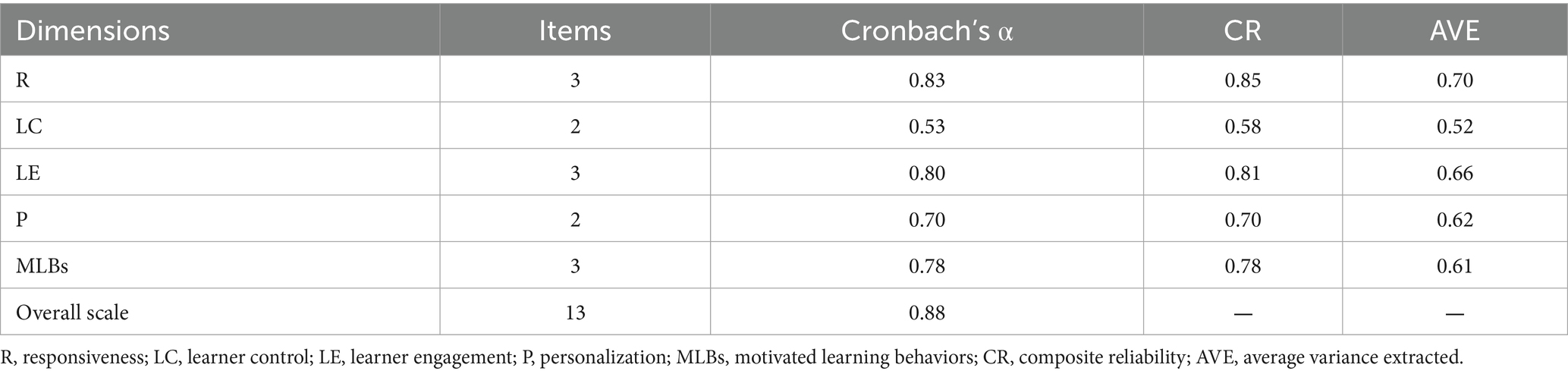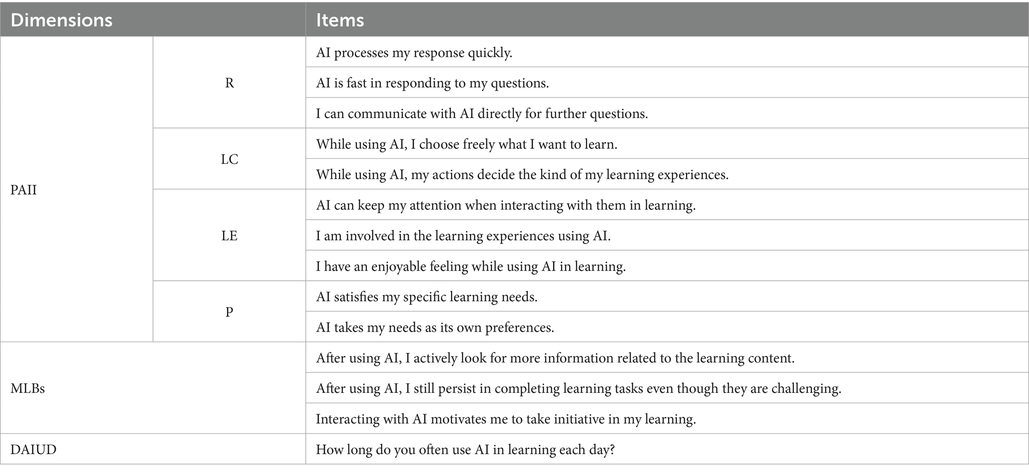 A structured questionnaire was used to investigate participants’ perceptions of AI interactivity, MLBs, and DAIUD. All constructs were measured (see Table A1) on a 5-point Likert scale ranging from 1 (strongly disagree) to 5 (strongly agree), with the exception of the DAIUD item, which adopted a 5-point frequency scale: 1 = “never,” 2 = “0 to 0.5 h per day,” and 5 = “more than 2 h per day.” The participants were asked to respond to the item, “how long do you often use AI in learning each day?” PAII was assessed using a 10-item scale adapted from prior work (Wang et al., 2025a), and MLBs were assessed using a 3-item scale adapted from earlier research (Wang and Wang, 2022). DAIUD reflects learners’ average daily time spent using AI tools for academic learning. The reliability and validity of the scale are presented below.
