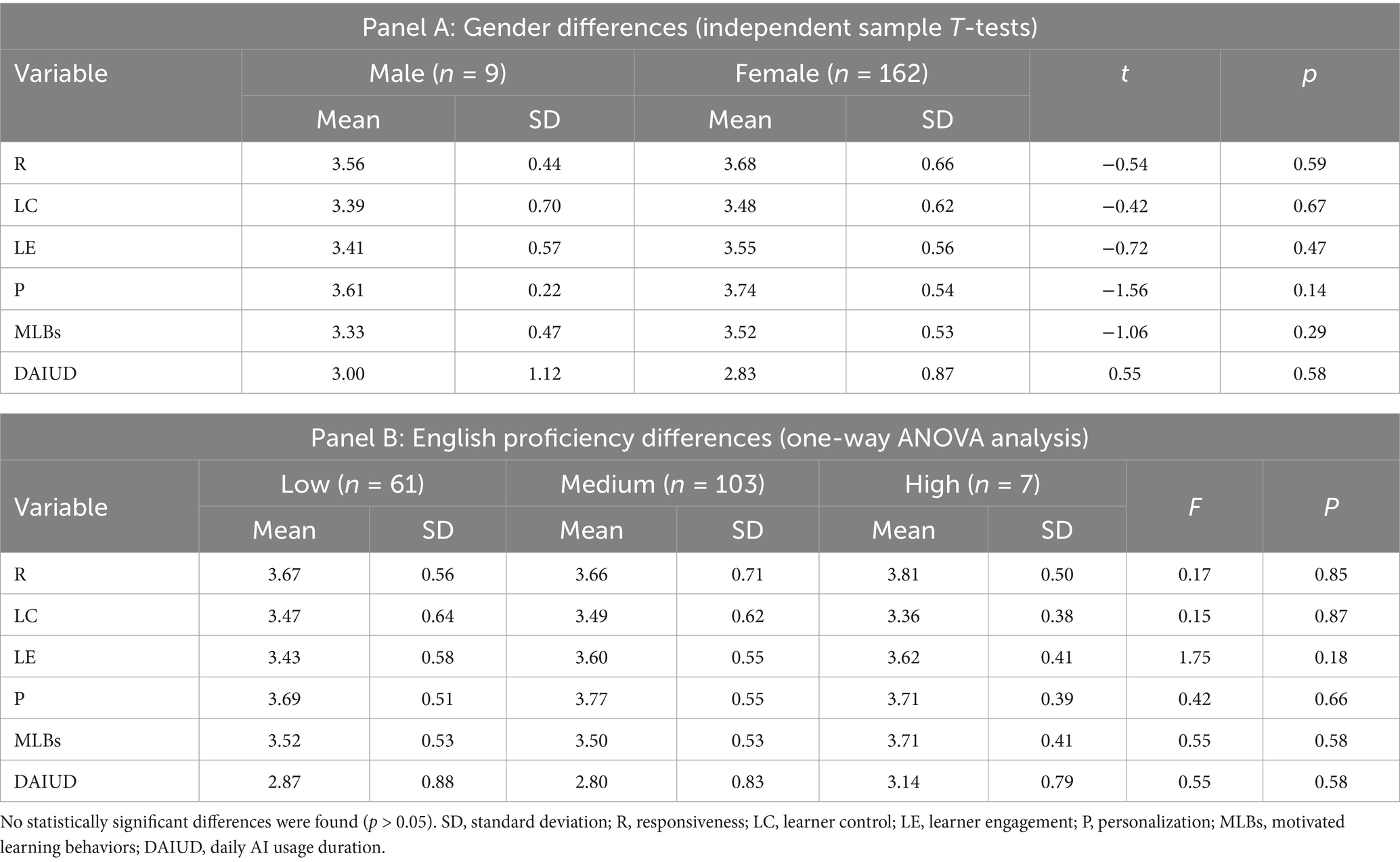 Independent-samples t-tests revealed no statistically significant gender differences across any of the study variables (p > 0.05; see Table 2, Panel A). Male (n = 9) and female learners (n = 162) reported comparable levels of PAII, MLBs, and DAIUD. Although the mean scores for R, LC, LE, and P were slightly higher among female learners, the differences were not statistically meaningful. Thus, gender did not exert a significant effect on learners’ PAII, MLBs, or DAIUD.
