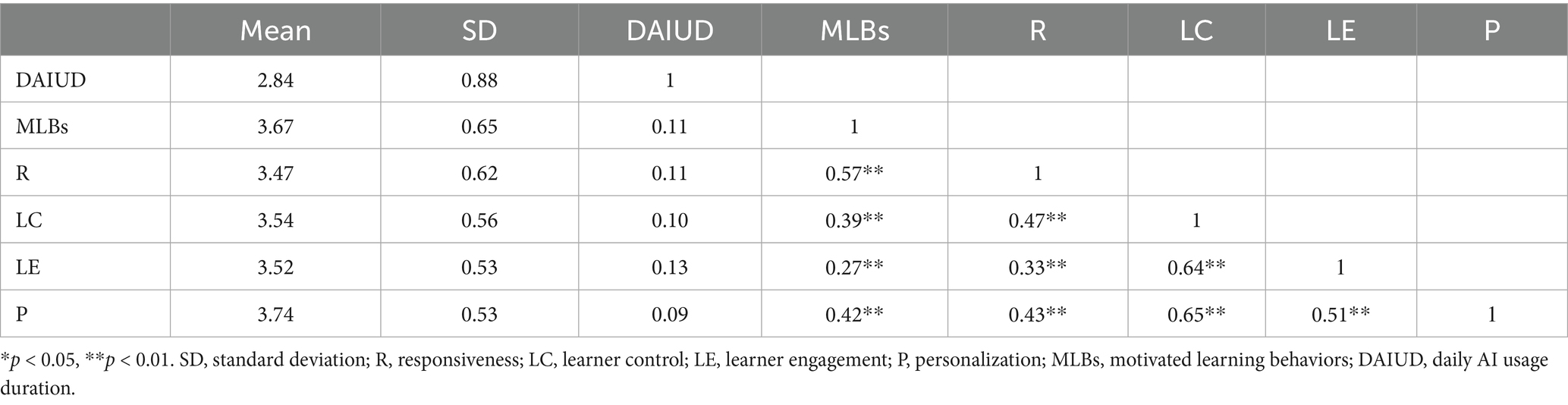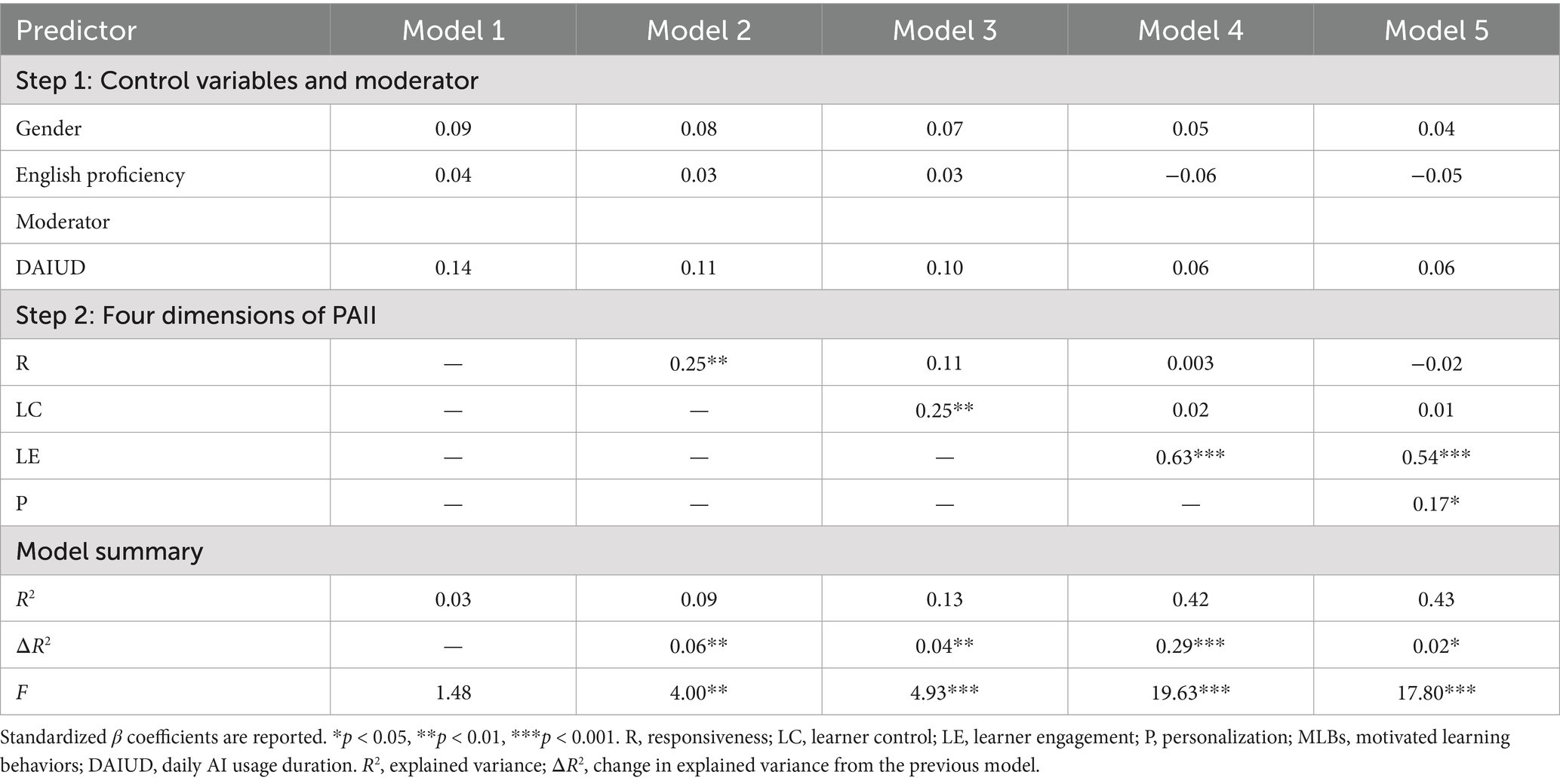 Pearson correlation analysis was conducted to examine the relationships among the core study variables (see Table 3). The results indicated that all four PAII dimensions were significantly and positively correlated with MLBs (r = 0.27–0.64, p < 0.01), implying that higher levels of perceived interactivity were associated with stronger motivated learning behaviors. Furthermore, the four dimensions of PAII were positively intercorrelated (r = 0.39–0.65, p < 0.01), reflecting satisfactory internal coherence among the subscales. Consequently, all four dimensions were deemed appropriate for inclusion in the hierarchical regression analysis to assess their combined predictive effect on MLBs. However, DAIUD was not significantly correlated with any of the main variables (p > 0.05), indicating that its role may be better understood as a moderator rather than a direct predictor.