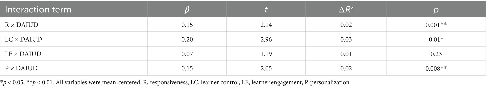 Moderation analysis was conducted to further examine whether DAIUD moderated the relationships between the four PAII dimensions and MLBs. As shown in Table 5, three out of the four interaction effects reached statistical significance, indicating that DAIUD partially moderated these relationships. Specifically, the interaction between LC and DAIUD was the strongest (β = 0.20, p = 0.01 < 0.05, ΔR2 = 0.03), suggesting that learners with longer AI usage duration derived more motivated behaviors from a heightened sense of control in AI-supported learning. The interaction between R and DAIUD was also significant (β = 0.15, p = 0.001 < 0.01, ΔR2 = 0.02), implying that learners with higher DAIUD benefited more from timely AI feedback. Likewise, the interaction between P and DAIUD was significant (β = 0.15, p = 0.008 < 0.05, ΔR2 = 0.015), showing that greater AI usage strengthened the contribution of adaptive and individualized feedback to MLBs.