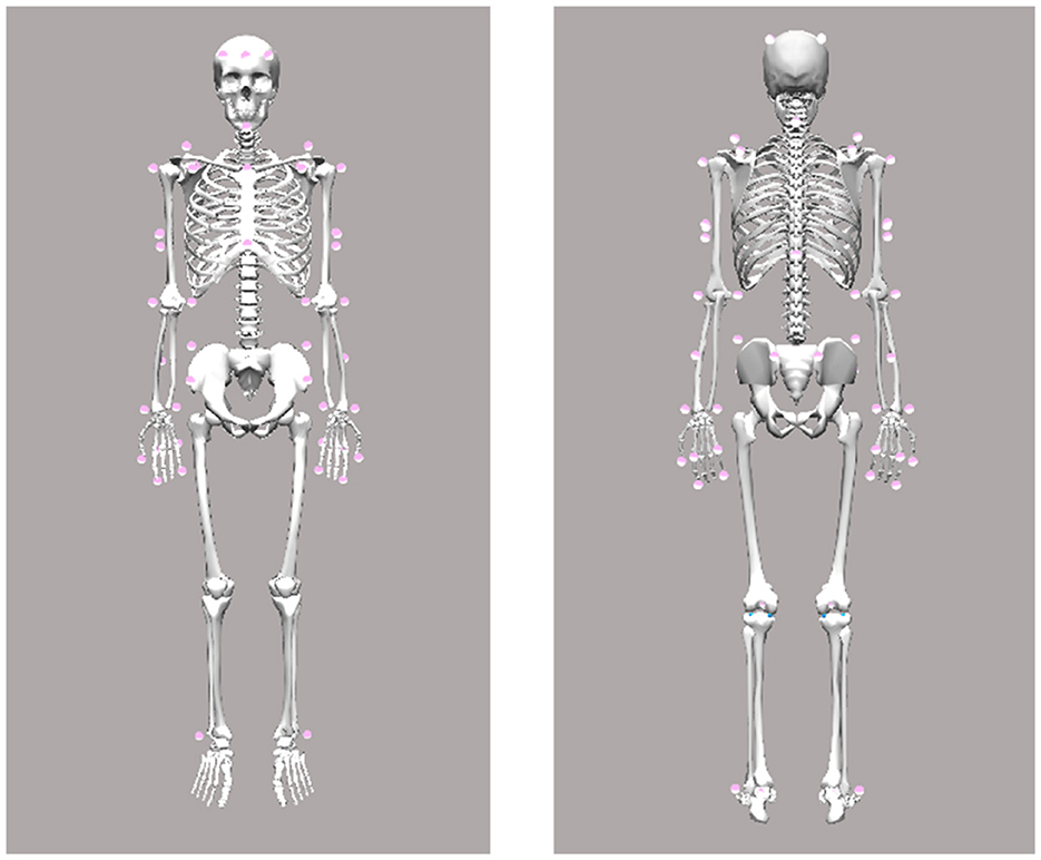 Body kinematics—including torso, head, and arms/hands –were recorded using a custom-designed marker set (see Figure 1) and a 12-camera infrared motion capture system (Qualisys AB, Göteborg, Sweden) operating at a sampling rate of 300 Hz. Simultaneously, a 2D video of the participant was recorded at 150 Hz and time-synchronized with the motion capture data. Marker trajectories were low-pass filtered using a second-order, zero-lag Butterworth filter with a cutoff frequency of 25 Hz. Segment positions and orientations were calculated using an inverse kinematics algorithm (V3D; C-Motion, Rockville, MD, USA). Joint centers at the wrist, elbow, and shoulder were estimated as virtual landmarks positioned midway between the lateral and medial anatomical markers (see Figure 1).