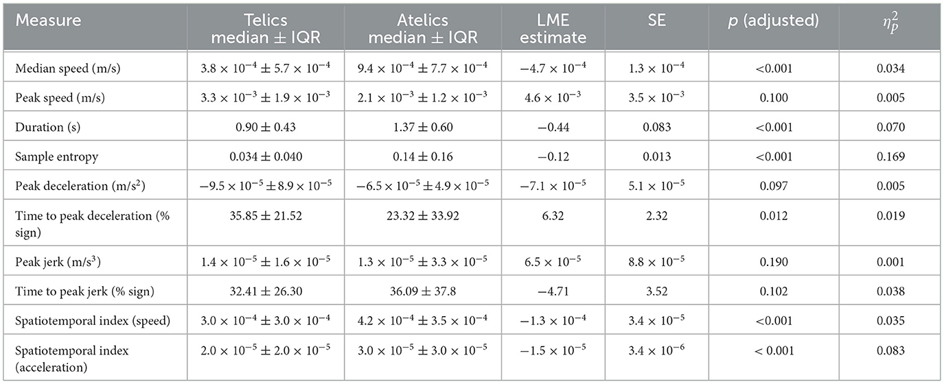 A total of 390 signs (34 telic and 31 atelic verbs per participant) were collected and included in this analysis. Pooled kinematic data are displayed in Table 1. Linear mixed-effects models revealed statistically discernible differences in movement kinematics between telic and atelic verbs. Telic verbs were characterized by significantly slower average wrist speed (estimate [Est] = −0.00047 m/s, SE = 0.00013, p < 0.001, = 0.034), shorter sign duration (Est = −0.44 s, SE = 0.083, p < 0.001, 0.070), and later timing of peak deceleration (Est = 6.32%, SE = 2.32, p = 0.012, 0.019) compared to atelic verbs (see Figure 3). Telic verbs also showed lower sample entropy (Est = −0.12, SE = 0.013, p < 0.001, 0.17) and lower spatiotemporal indices for velocity and acceleration (both p < 0.001, 0.035 and 0.070, respectively), reflecting more regular and less variable movement patterns. These results are consistent with telic verbs involving brief, controlled, and well-structured movement profiles.