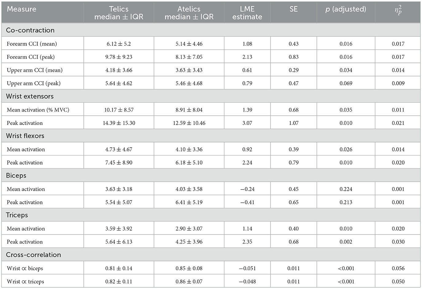 Analysis of forearm and upper arm muscle co-contraction indices (CCI) indicated significantly greater mean and peak co-contraction in telic verbs compared to atelics (forearm mean CCI: Est = 1.08, SE = 0.43, p = 0.016, = 0.017; forearm peak CCI: Est = 2.13, SE = 0.83, p = 0.016, = 0.017; upper arm mean CCI: Est = 0.61, SE = 0.29, p = 0.034, = 0.014). This suggests greater involvement of antagonist muscle stiffness and joint stabilization during the production of telic verbs.