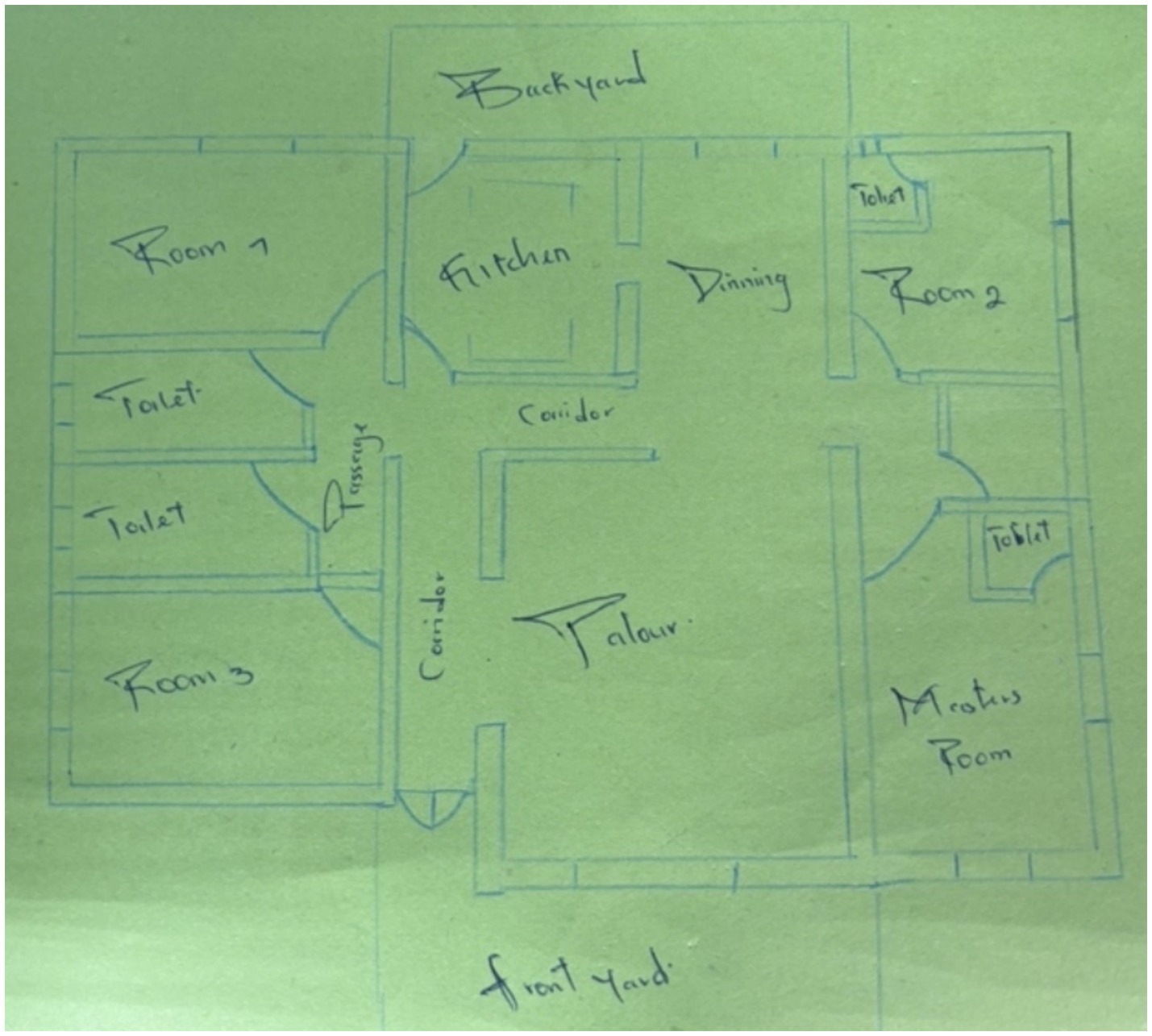 Floor plan sketch on green paper depicting layout of a house. Features include a backyard, kitchen, dining area, three rooms, two toilets, a master's room with a toilet, a parlor, corridors, and a front yard.