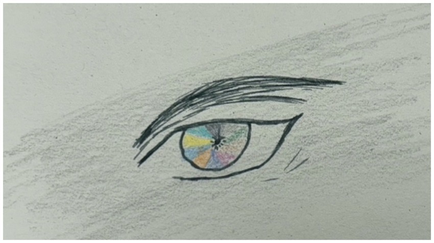 The participants also highlighted important aspects of positive peace, building equitable and caring social systems, and how freedom and peace are interlinked. One participant argued that peace is present “when there is freedom and people can do and say what they want.” The complexities of achieving peace and freedom in a “violent world” were thoroughly discussed, with one participant sharing: “we cannot find peace unless we are free, and we cannot be free until we are at peace.” Other participants stated that peace occurs when “everyone is equal and has freedom of speech,” when we are all living in “a happy and positive space,” a “place where we cannot be judged,” where we can all “be yourself,” and “when we understand each other.” For one participant in particular, “peace is when you love and respect people in your society. Peace makes people have better understanding together.” In a similar regard, a participant chose to represent their vision of peace, from a positive peace lens, by drawing an eye with a multi-colored iris (Figure 3). They described their image as a representation of valuing diversity and argued that if we celebrate everyone, and appreciate our differences, then peace will be possible.