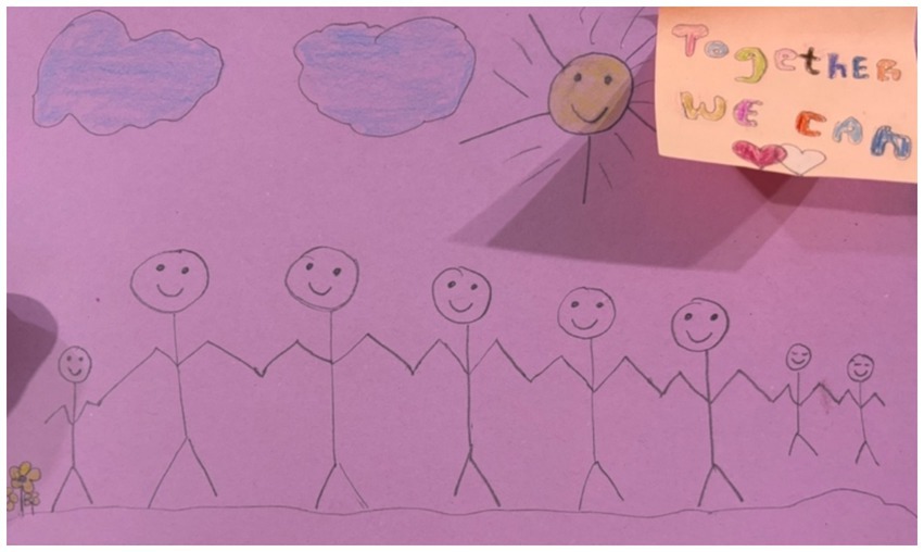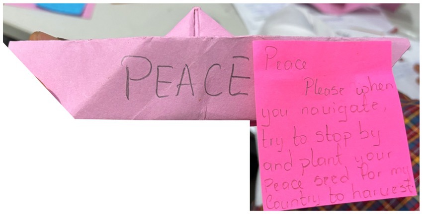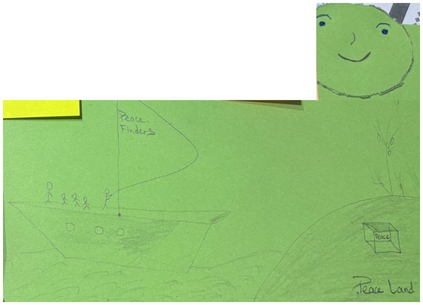 The data analysis was derived from all the materials submitted by the participants, including their art representations of peace, which were captured in drawings, comments, and poems; completed handout sheets; and researcher notes recording key comments, insights, and discussions. The researcher engaged in thematic analyses to generate key findings (Braun and Clarke, 2006). Thematic analysis is a helpful approach for research centering on underrepresented voices (Braun and Clarke, 2006, 2024), in this case, that of children and youth affected by armed violence, as it prioritizes participants’ voices in the data. The thematic analysis process involved becoming familiar with the data, including reviewing written and visual data, then generating codes, and finally building themes in alignment with the research questions (Braun and Clarke, 2006, 2024). The reflexive approach also included ongoing debrief discussions among the research team in relation to observations, strategies to mitigate researcher bias, and contextual influences. For example, the Canadian focus groups occurred shortly after the fall of the Bashar al-Assad regime, and given that many of the participants were from Syria, including one of the community partner facilitators, this event informed our discussions on peace, requiring the researcher and community partner to maintain regular check-ins throughout the focus groups.