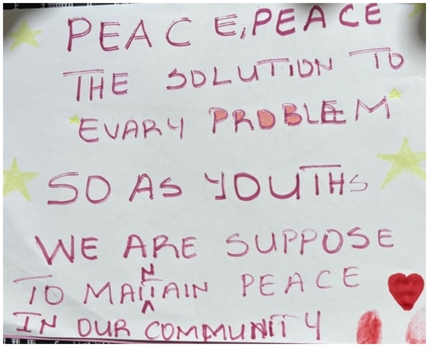 Peace is a state in which there is no war and no lack of understanding. Where there is no revenge and no fighting, just calmness” (research participant). The participants stated that at its core, peace exists when everyone is free from violence and violent structures, when there is “safety in your country,” “no fighting,” and “no violence or war.” They described that peacelessness occurs “when there is violence, lies, theft, and disobedience” and this is enabled by “people that do not want you to have peace.” In this regard, the children and youth described how corruption, tribalism, leaders who are “bad people who have no regard for others well-being,” and the existence of gangs or other armed actors, compromise children’s ability to experience peace, because “fear dominates” in these conditions. The children and youth described a range of impacts of collective violence, including loss of life, illness and injury, and a loss of “calmness” or mental wellbeing.