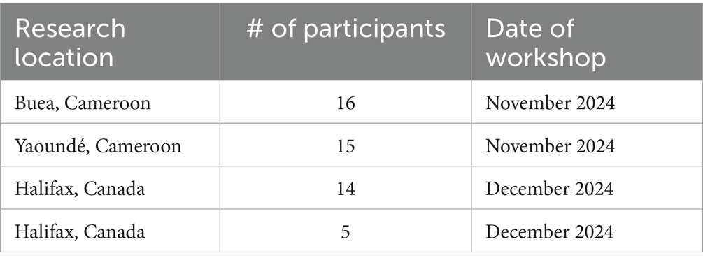 In Cameroon, the research was conducted in partnership with Local Youth Corner Cameroon, a youth, peace, and security organization leading community-engaged programming with children and youth affected by the two conflicts occurring in the country. Participants were recruited with a poster shared with community partners. One focus group took place in Buea, a region impacted by the Anglophone Crisis, an internal conflict that began in 2017, and the second focus group was held in Yaoundé, the capital city, with children and youth from diverse regions of the country. In total, 31 children and youth participated in the focus groups in November 2024. In Canada, two focus groups were held in December 2024 in collaboration with the YMCA of Greater Halifax/Dartmouth, Immigrant Programs. The participants were recruited with a poster shared through YMCA community programming notifications. A total of 19 newcomer children and youth, representing multiple countries of origin and experiences with varying forms of insecurity and armed violence, participated (Table 1).