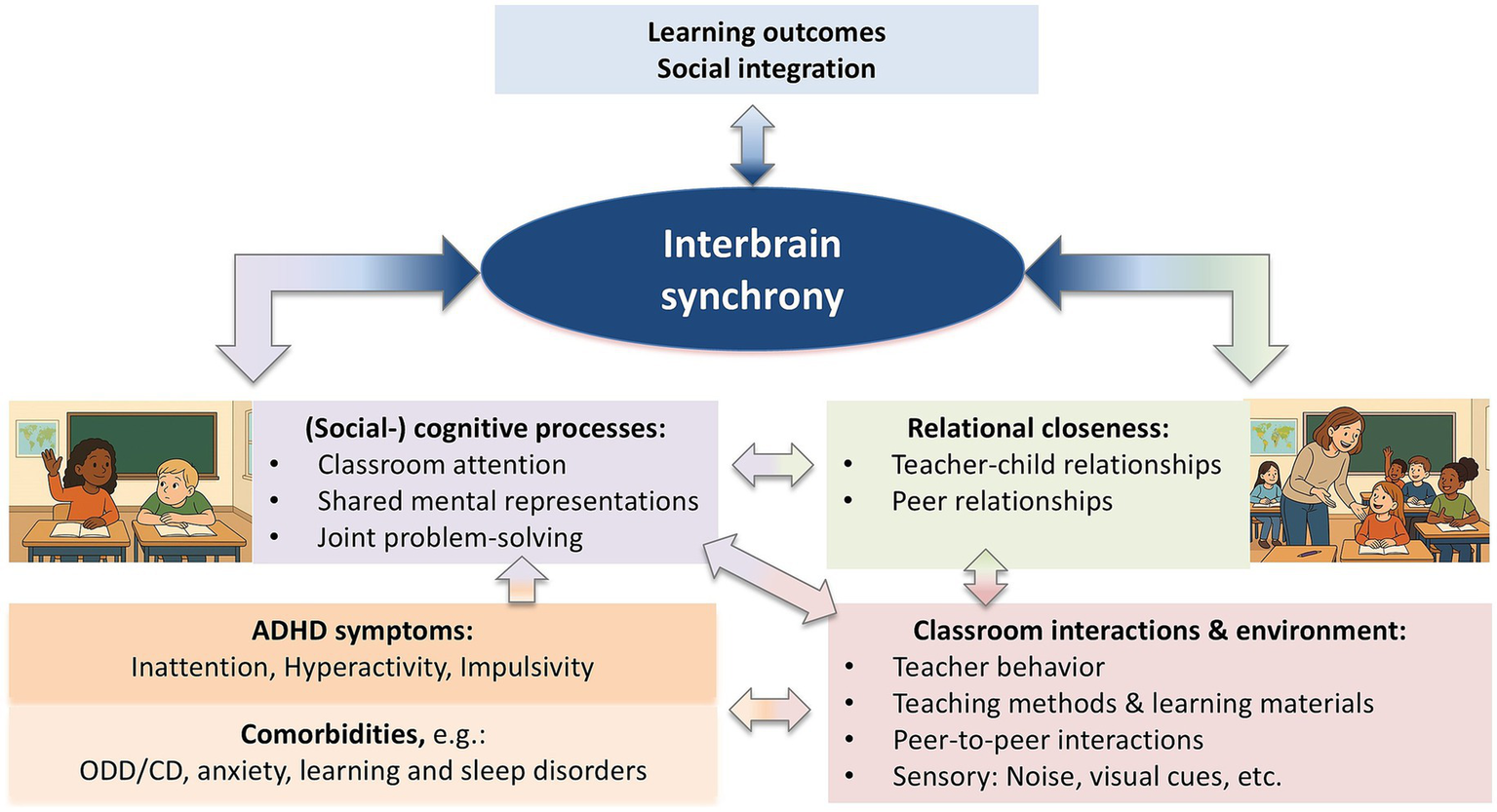 Proposed pathways of how IBS can serve as a marker and facilitator of classroom learning in students with ADHD. ADHD and its comorbid symptoms (e.g., anxiety disorders, oppositional defiant disorder (ODD)/conduct disorder (CD), learning disorders, and sleep disorders) can directly interfere with the (social-)cognitive processes involved in learning. These processes include sustaining attention, forming accurate mental representations of learned concepts, or engaging in collaborative learning activities, such as joint problem solving. In addition, ADHD and its comorbid symptoms may interact with features of the classroom environment (e.g., noise levels) and classroom interactions (e.g., teacher behavior, peer relationships), influencing both (social-)cognitive processes and relational closeness between student peers and between teacher and students. Both shared (social-)cognitive processes and relational closeness have been linked to inter-brain synchrony (IBS) in empirical studies. In turn, higher levels of IBS have been positively associated with social integration and learning outcomes. The model is adapted from Reindl et al. (2024) and extends it to children with ADHD.