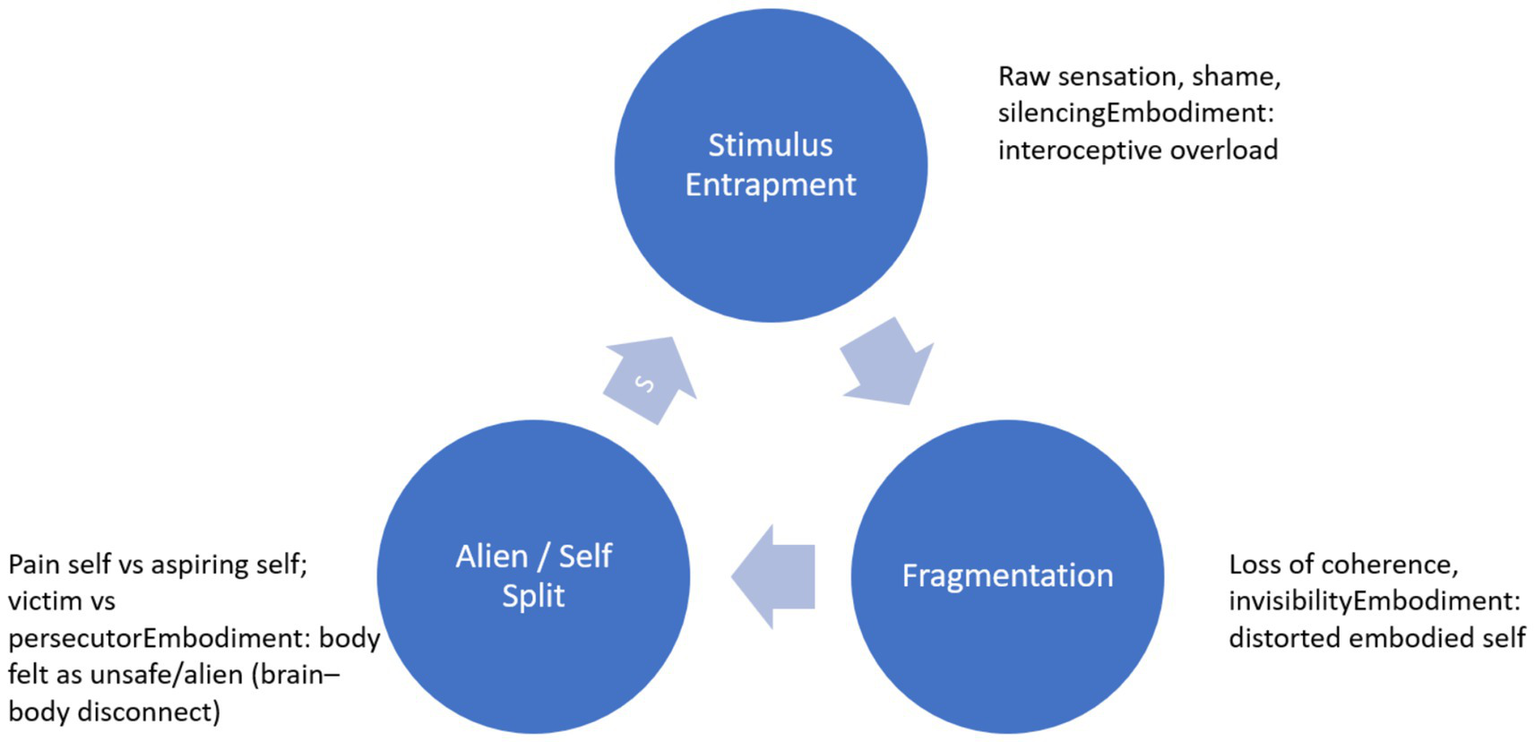 Figure 1. This figure illustrates chronic pain as a dissociative cycle comprising stimulus entrapment, fragmentation, and alienation/self-split, which reinforce one another in a vicious loop. At each stage, trauma disrupts embodiment: bodily signals are overloaded, distorted, or experienced as alien, leading to disconnection from the self. Therapeutic repair offers an exit pathway, where relational safety and interoceptive awareness enable re-integration of the embodied self.