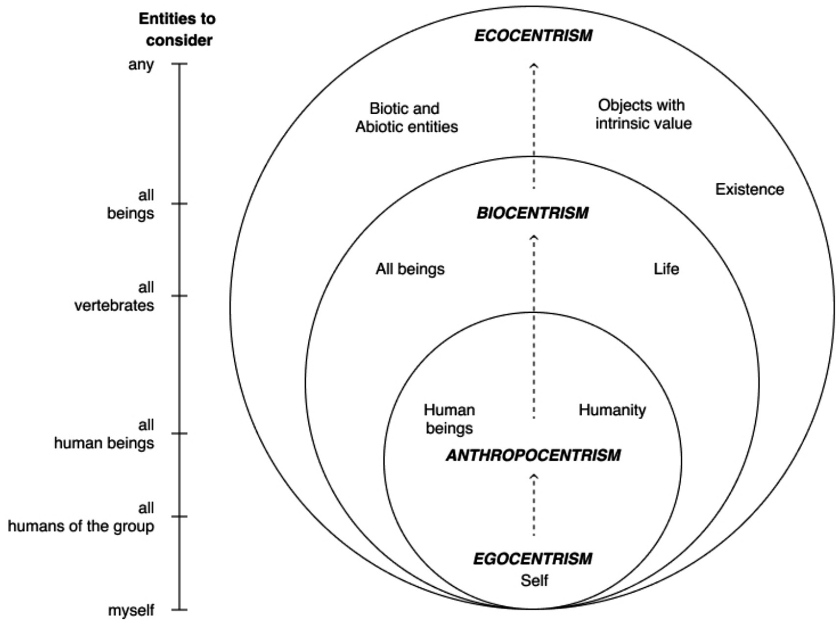 The concept of anthropocentrism comes back in environmental ethics; where there are three main value systems that underlie support for environmental issues: anthropocentrism, biocentrism and ecocentrism. All these visions express environmental concern and an interest in preserving natural resources, but their interest lies in different motivations (Samuelsson, 2013; Kopnina et al., 2018). Anthropocentrism is the belief that humans have a greater intrinsic value in comparison to other species (Goralnik, 2011). In that view, a healthy ecosystem is fundamental to support and benefit humans. Biocentrism considers that all living beings have inherent value and places greater importance on living components of the environment. It does not consider abiotic factors of the environment (Derr and McNamara, 2003). Ecocentrism values the ecosystem, considering equally important both biotic and abiotic components, involving also chemical and geological components of nature when supporting environmental issues. Ecocentrism considers nature worth preserving because of its intrinsic value, not for utilitarian reasons (Washington et al., 2017) (Figure 1).