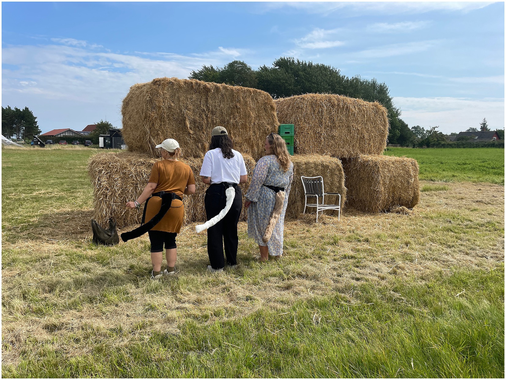 Figure 2. Participants testing the robotic tails the picturesque landscape of Samsø Energy Academy, here “wiggling their tails” as part of the workshop.