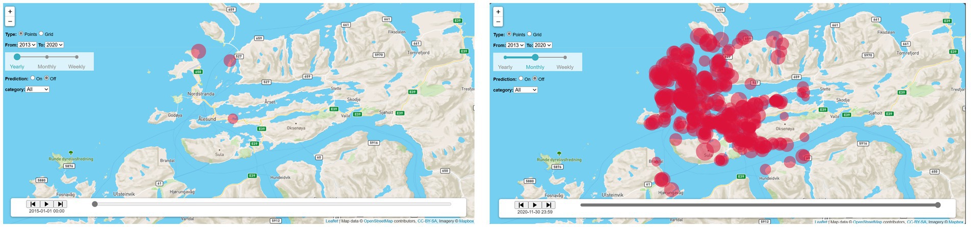 Figure 3. Screenshot of the visualization tool from the PlastOPol marine plastic pollution data platform: left panel shows conditions in 2015; right panel shows conditions in 2020 (Wu et al., 2023).