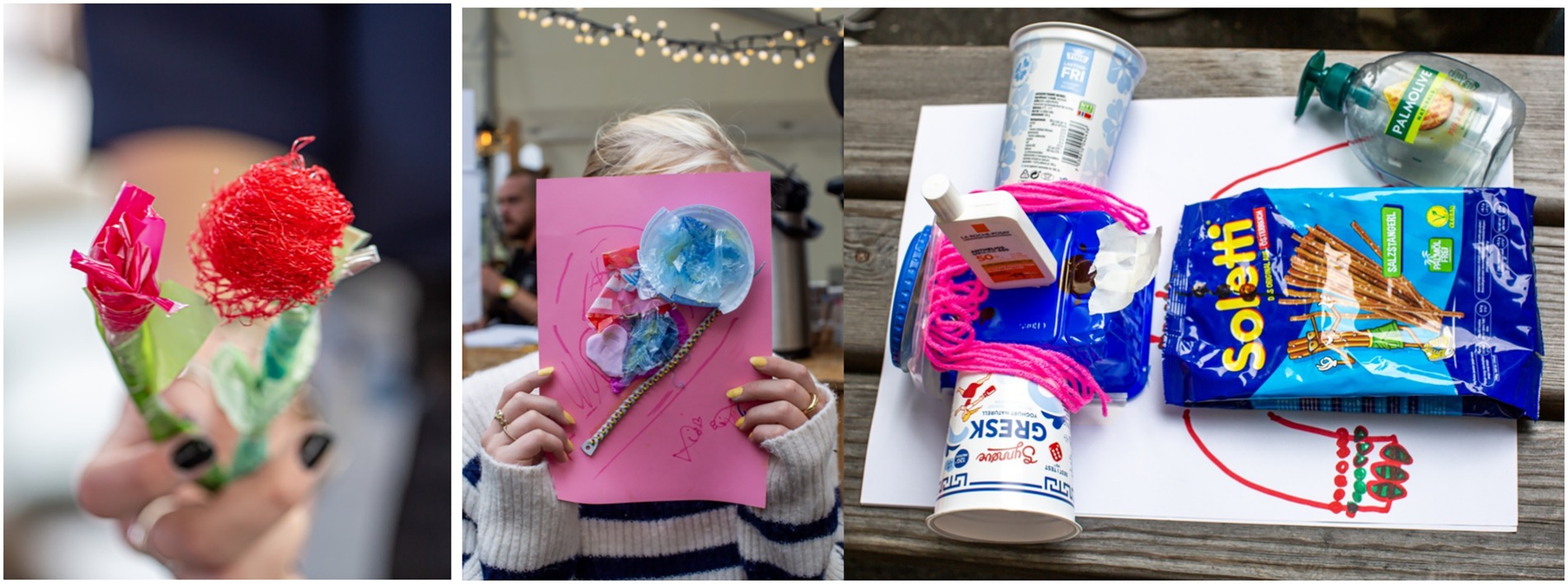 Figure 4. Photos representing (from left to right) flower by a girl working alone, marine ecosystem by a group and a plastic robot man by a group. Adapted with permission from GRID-Arendal, 2024.