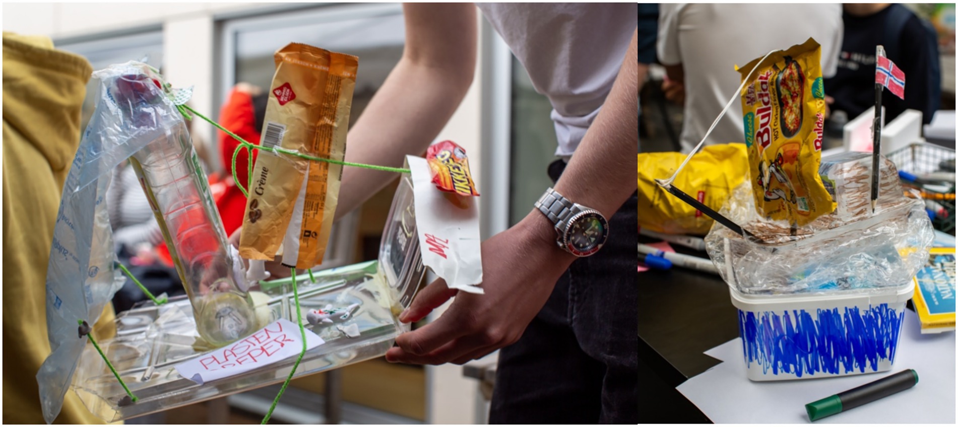 The workshop was enriched with an element of playfulness through facilitators sporting robotic tails, aimed, in this case, at breaking the ice and establishing a congenial atmosphere for collaborative creativity. We had brought the same robotic tails that we had used in our rural workshop on Samsø, but the participants were too many to allow all to test it. Therefore, we ourselves and a few of the facilitators wore the tails during the full workshop, including while walking around interacting with participants. In addition to the project researchers, we had access to facilitators affiliated with Grid Arendal5, and the accompanying educational personnel from the pupils’ respective schools. These individuals gently guided the groups in a collaborative art project, encouraging them to craft artworks utilizing the plastic materials. As we were interested in what the participants were going to make of the task – we did not want to limit them – we instructed the facilitators to be supportive and contribute to a safe environment. Therefore, the facilitators were to have a “yes-and” approach to the task and to all the participants´ suggestions.