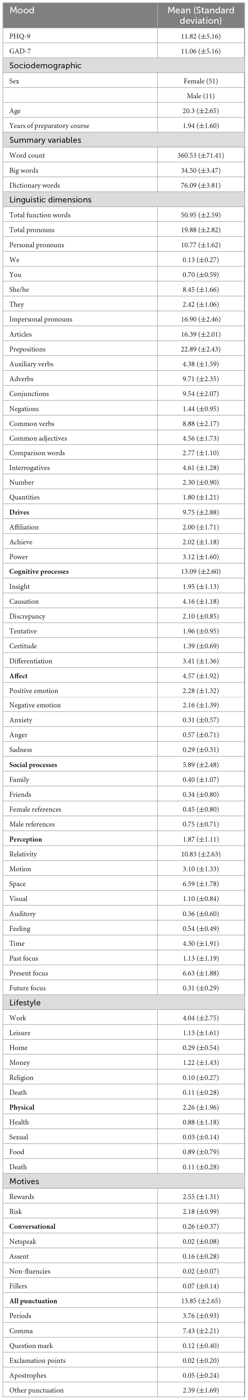 Methods: Participants were 62 pre-university students (51 females, 11 males; M = 20.3 years, SD = 2.65) who completed a self-report form shared via WhatsApp or in-person at preparatory schools. The form included sociodemographic questions, the GAD-7 and PHQ-9 scales, and the upload of an argumentative essay written within the previous month as part of their regular coursework. Essays were analyzed using LIWC software, and multivariate regression models identified linguistic features associated with anxiety and depression scores.