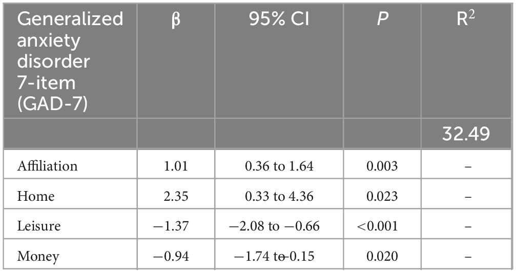 Following this, we performed two multivariate linear regression analyses to separately measure associations between GAD-7 and PHQ-9 scores as dependent variables, and all variables included in the previous step for each dependent variable. As determined by the literature, all models tested four assumptions: linearity, homoscedasticity, independence, and normality (Osborne and Waters, 2002). These assumptions were evaluated through graphical inspection of residual plots and statistical diagnostics. Linearity and homoscedasticity were assessed via scatterplots of standardized residuals versus predicted values. Normality of residuals was verified through histograms, Q–Q plots, and the Kolmogorov–Smirnov test. Independence of residuals was examined using the Durbin–Watson statistic. To assess potential multicollinearity, we calculated Variance Inflation Factor (VIF) values for all predictors; all VIFs were below five, indicating no collinearity concerns. All assumptions were satisfactorily met for the final models.