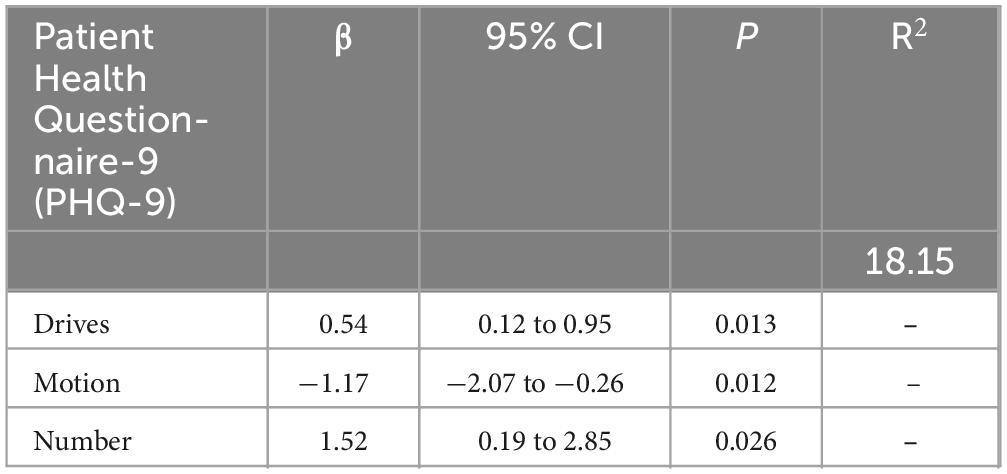 Following the GAD-7 model, univariate regression analyzes were performed for all sociodemographic and LIWC variables, as independent variables, and the PHQ-9 scores as dependent variables, in order to select the independent variables that would enter the first version of the multivariate model. Table 3 shows the final model for PHQ-9, demonstrating that the main predictors were: (i) Drives; (ii) Motion; and (iii) Number, are responsible for an adjusted R2 of 18.15%. The overall model fit was statistically significant, F(3, 58) = 5.51, p = 0.002, supporting the adequacy of the selected predictors.