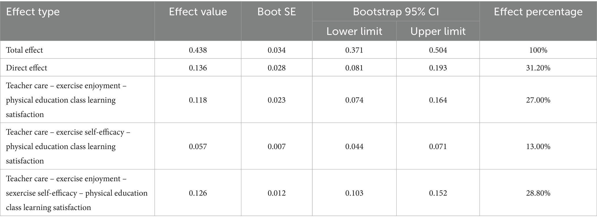 After conducting standardized effect size analysis and significance tests on the pathways through which teacher care influences college students’ satisfaction with physical education courses (Table 4), the Bootstrap 95% confidence interval for the total indirect effect of teacher care on college students’ physical education class learning satisfaction does not include 0, indicating that “exercise enjoyment” and “exercise self-efficacy” have a significant mediating effect between teacher care and physical education class learning satisfaction (direct effect accounts for 31.20%, indirect effect accounts for 68.80%). This mediating effect consists of three indirect effects: (1) The indirect effect generated by the path from “teacher care” to “exercise enjoyment” to “physical education class learning satisfaction,” whose Bootstrap 95% confidence interval does not include 0, indicates that exercise enjoyment plays a significant mediating role between teacher care and learning satisfaction in physical education classes (standardized value = 0.118, accounting for 27.00% of the total effect), This result validates Hypothesis H2; (2) the indirect effect generated by the path from “teacher care” to “exercise self-efficacy” to “satisfaction with physical education class learning,” whose Bootstrap 95% confidence interval does not include 0, indicating that exercise self-efficacy plays a significant mediating role between teacher care and satisfaction with physical education class learning (standardized value = 0.057, accounting for 13.00% of the total effect), this result validates Hypothesis H3; (3) The indirect effect generated by the path from “teacher care” to “exercise enjoyment” to “exercise self-efficacy” to “physical education class learning satisfaction” has a Bootstrap 95% confidence interval that does not include 0, indicating that exercise enjoyment and exercise self-efficacy play a significant chained mediating role between teacher care and physical education class learning satisfaction (standardized value = 0.126, accounting for 28.80% of the total effect). This result validates hypothesis H4.