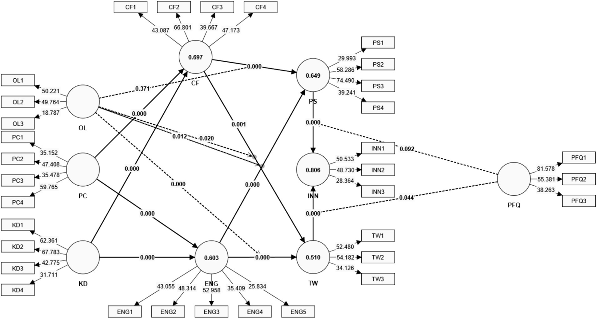 In conclusion, the findings provide substantial evidence supporting the theoretical framework, demonstrating the critical roles of PC, KD, ENG, and CF in driving PS, TW, and INN. The mediating roles of PS and TW elucidate the mechanisms through which foundational constructs impact innovation, while the moderating effects of OL and PFQ underscore the contextual factors that shape these dynamics. These results align with and extend existing literature, offering nuanced insights into the interplay of individual and team-level traits in fostering adaptability and innovation in educational and vocational settings.
