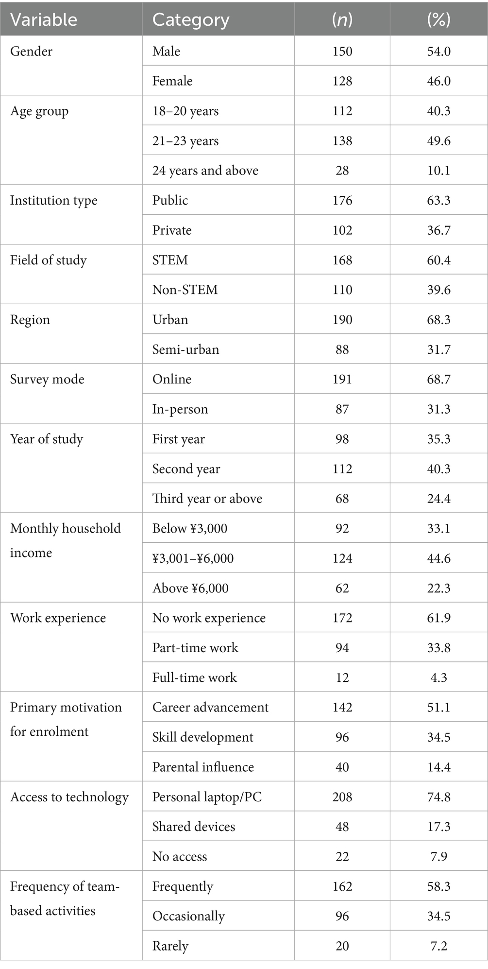 Surveys were administered using a dual data collection strategy, online surveys were conducted via Qualtrics and Wenjuanxing, leveraging institutional networks for direct outreach to students through email and messaging platforms (e.g., WeChat). For participants with limited digital access or less likely to respond to online invitations, in-person surveys were conducted in semi-urban regions (refer to areas that exhibit characteristics of both urban and rural environments), ensuring inclusivity and equitable participation (Huang et al., 2023). Data collection was completed over 12 weeks (September–November 2024), yielding 278 valid responses (191 online, 87 in-person). The response rate was 62%, consistent with similar studies (Ahmed and Aziz, 2024). Data validation ensured minimal missing responses (<2%), addressed through follow-ups or imputation techniques.