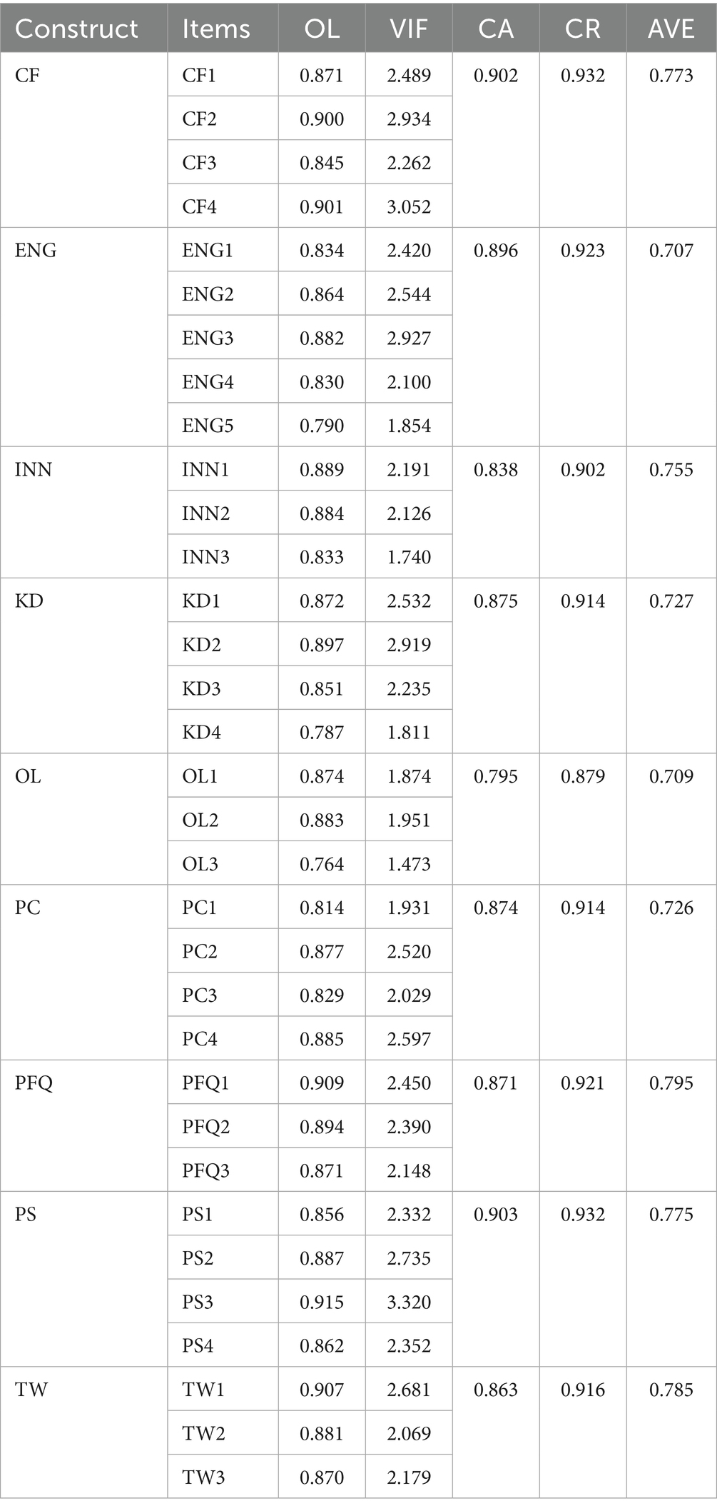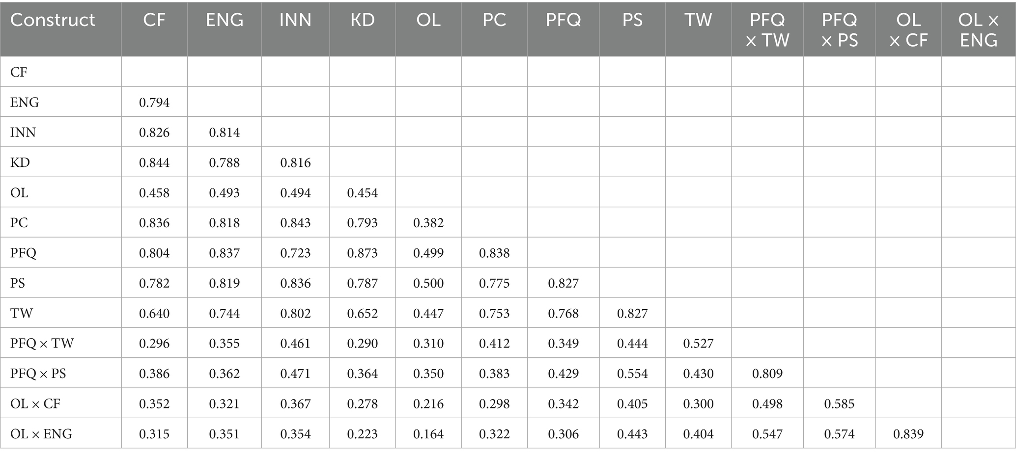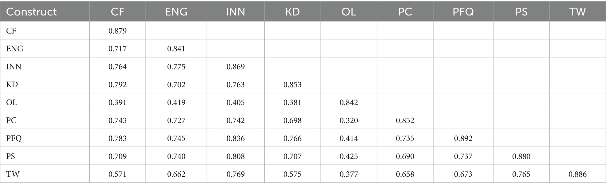 Composite Reliability (CR) values, which ranged from 0.879 to 0.932 across constructs, exceeded the acceptable threshold of 0.70, confirming internal consistency (Hair et al., 2022). Similarly, Cronbach’s Alpha (CA) values for all constructs were above 0.70, with cognitive flexibility (CF) at 0.902 and Engagement (ENG) at 0.896, further establishing reliability. These values align with prior recommendations that emphasize high CR and CA as prerequisites for reliable scales in PLS-SEM models (Henseler et al., 2015). Convergent validity was also confirmed, as the Average Variance Extracted (AVE) for all constructs surpassed the 0.50 threshold, indicating that the constructs captured more than 50% of the variance in their respective items (Fornell and Larcker, 1981). For example, the AVE for Innovation (INN) was 0.755, affirming the construct’s ability to explain a substantial portion of its items’ variance.