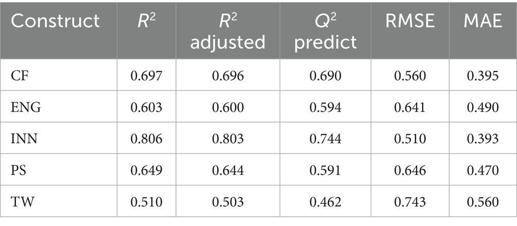 The structural model’s fit and predictive relevance (Table 5) were evaluated using R2 (explanatory power), R2-adjusted (model stability), Q2-predict (predictive relevance), RMSE (Root Mean Square Error − prediction accuracy), and MAE (Mean Absolute Error − prediction error), aligning with PLS-SEM guidelines (Hair et al., 2011). The R2 values indicate strong explanatory power for most constructs, with Innovation (INN) having the highest R2 of 0.806, followed by cognitive flexibility (CF) at 0.697 and Problem-Solving (PS) at 0.649. Engagement (ENG) and Teamwork (TW) exhibit moderate variance explained, with R2 values of 0.603 and 0.510, respectively. The R2-adjusted values closely align with R2, confirming model stability and minimal overfitting.