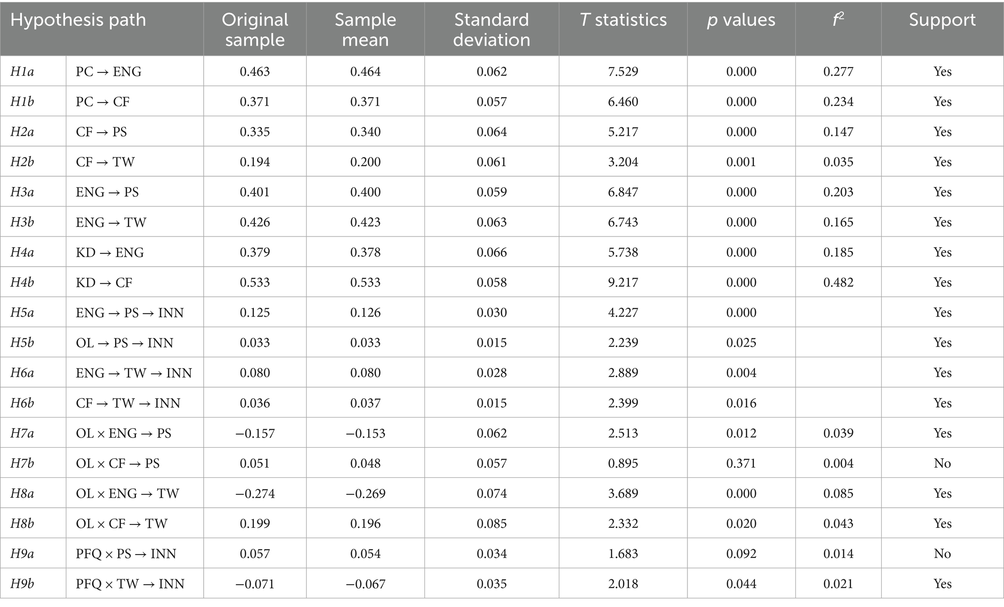 For H5 and H6, the mediating roles of PS and TW highlight their importance in linking ENG and CF to Innovation (INN). ENG influences INN through PS (β = 0.125, t = 4.227, p = 0.000) and TW (β = 0.080, t = 2.889, p = 0.004), while CF affects INN via TW (β = 0.036, t = 2.399, p = 0.016). These results highlight the pathways through which foundational constructs like engagement and flexibility are translated into innovative outcomes. Collaborative problem-solving plays a crucial role, allowing engaged individuals to generate creative solutions and address uncertainty effectively (Griffin and Guez, 2014; Lyu et al., 2023). Similarly, teamwork processes leverage cognitive diversity, enabling teams to integrate diverse inputs into novel outputs (De Dreu, 2006; García-Buades et al., 2016).