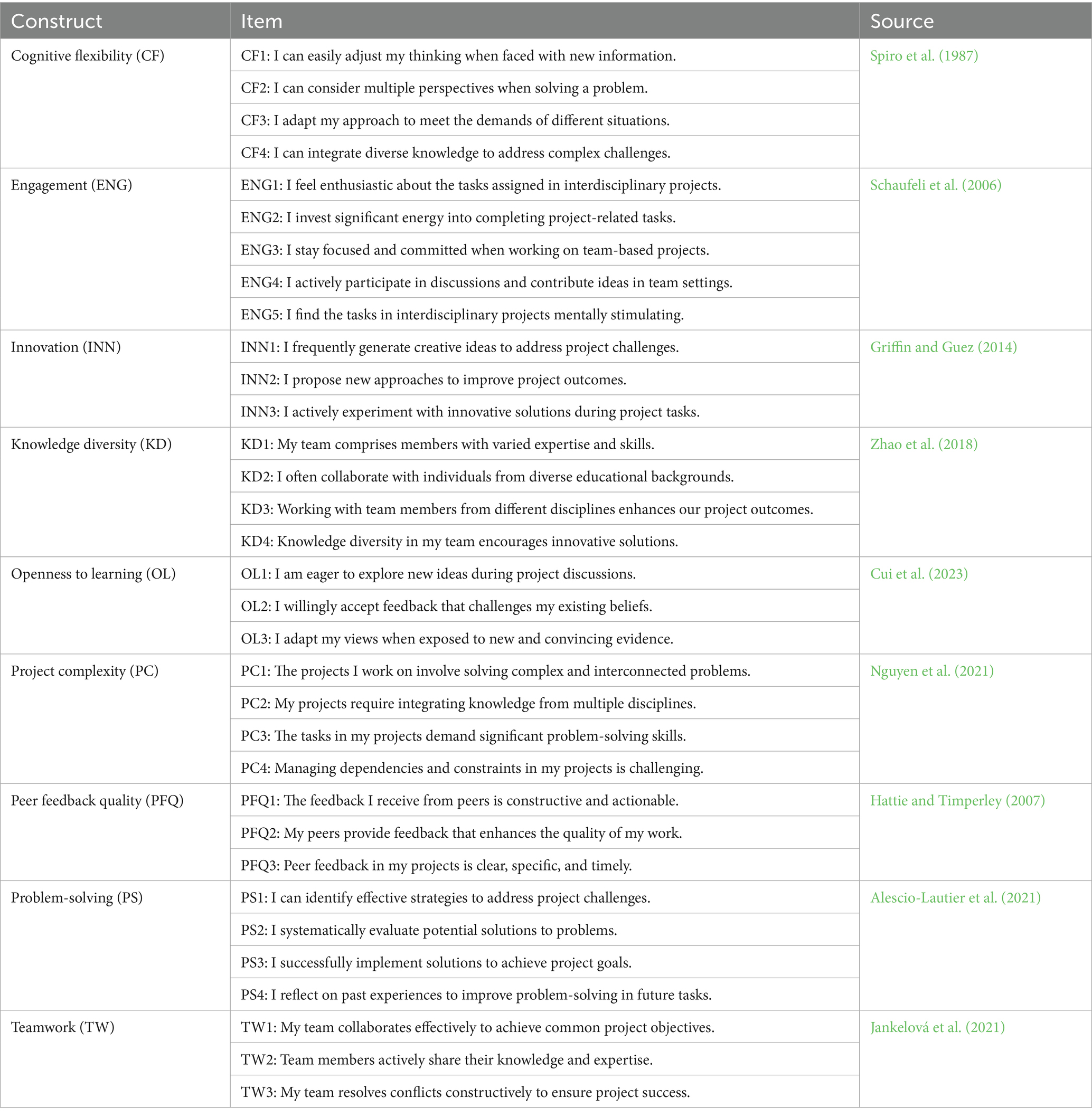 • Cognitive flexibility was measured using 4 items adapted from Spiro et al. (1987), emphasizing adaptability and perspective-taking, as these dimensions are critical for interdisciplinary learning.