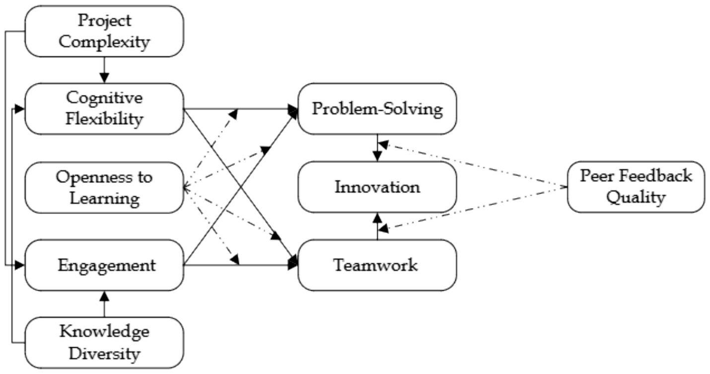 Cognitive Flexibility Theory (CFT) emphasizes the importance of restructuring existing knowledge to adapt to novel or complex environments (Spiro et al., 1987). Traditionally, the theory is concerned with individual cognitive adaptability, focusing on internal schema restructuring to handle ill-structured problems. However, this study extends CFT to include external antecedents such as project complexity and knowledge diversity, which stimulate cognitive flexibility by exposing individuals to diverse, dynamic challenges. This extension aligns with evidence that complex tasks enhance cognitive adaptability and enable individuals to navigate uncertainty effectively (Spiro and Weitz, 1990). Furthermore, CFT’s scope is broadened to link cognitive flexibility not only to problem-solving but also to innovation, positioning it as a critical enabler in interdisciplinary team settings where adaptability drives creative outcomes. By situating cognitive flexibility within collaborative frameworks, the study demonstrates that this adaptability is not merely reactive but instrumental in shaping the dynamic interplay of team-based innovation.