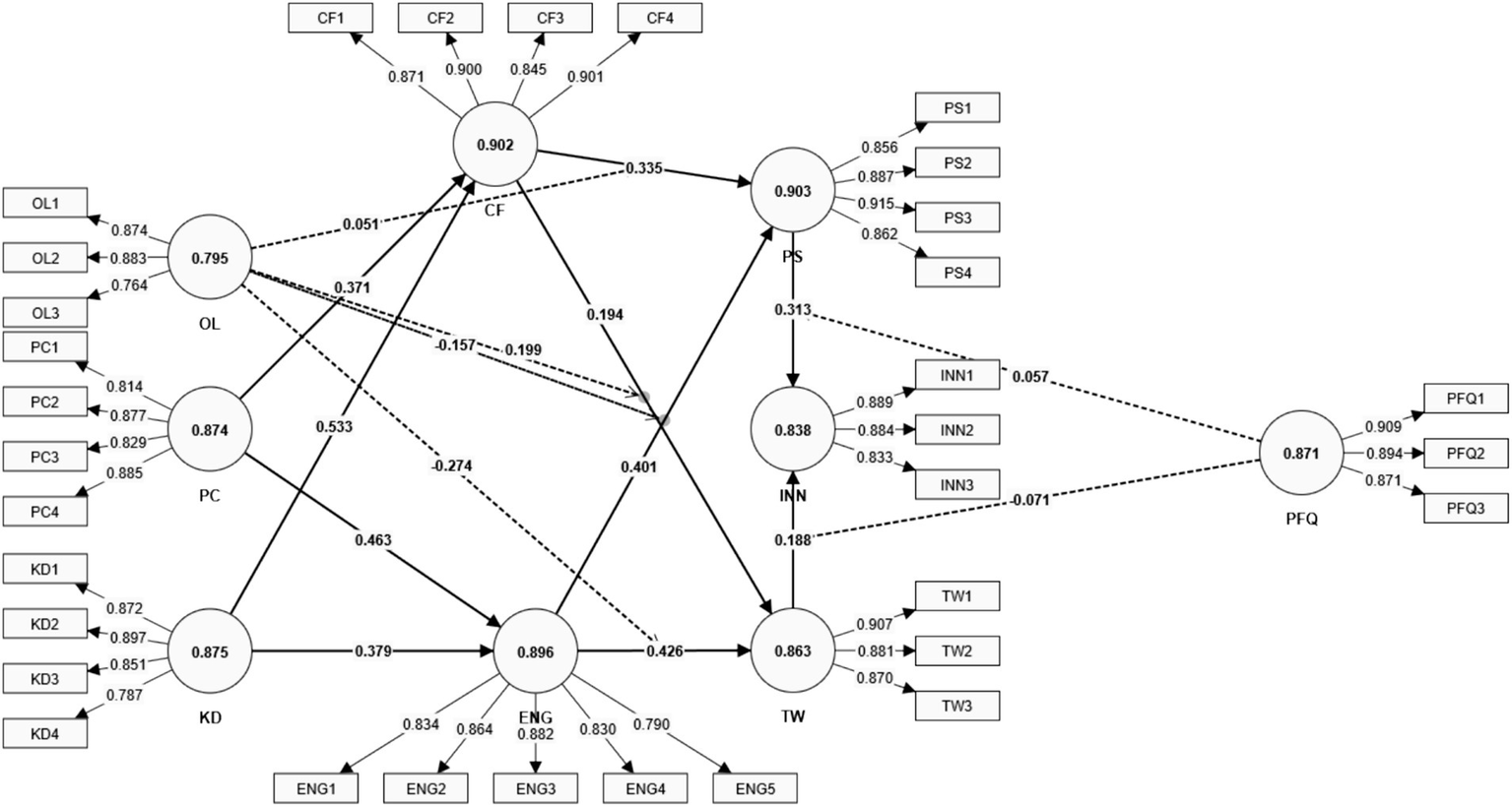 Openness to learning is a critical factor in enhancing engagement, cognitive flexibility, and problem-solving across educational and organizational settings. It fosters curiosity, adaptability, and willingness to embrace new ideas, leading to more effective learning and interpersonal interactions (Al-Muqaram and Al-Amara, 2017; Huang et al., 2023). Openness enhances the quality of engagement by encouraging learners to explore ideas and actively participate in collaborative tasks (Tjosvold et al., 2005). It also moderates the relationship between cognitive flexibility and problem-solving by promoting innovative thinking and persistence in overcoming challenges (Cui et al., 2023). Studies demonstrate that openness supports problem-solving in both structured and unstructured tasks, particularly when combined with external experiences, such as study abroad programs (Cho and Morris, 2015). Given its importance in facilitating learning and adaptive behaviors, openness to learning is expected to strengthen the influence of engagement and cognitive flexibility on problem-solving. Thus: