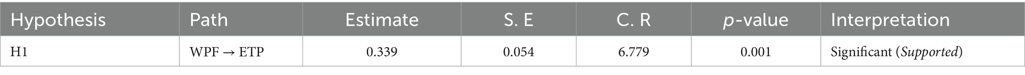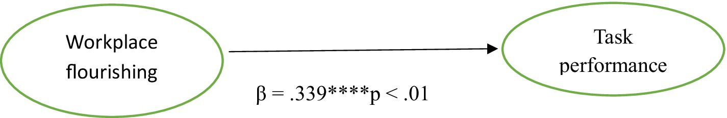 Given that data for both the predictor and outcome variables were collected from the same source via a self-report questionnaire, the potential for common method variance (CMV) was considered. To statistically assess this risk, this paper employed Harman’s single-factor test (Podsakoff et al., 2003). An exploratory factor analysis including all items from the Workplace Flourishing and Task Performance scales was conducted. The unrotated factor solution revealed multiple factors with eigenvalues greater than 1, and no single factor emerged that accounted for the majority of the covariance (the largest factor explained less than 50% of the total variance). This result indicates that CMV is not a likely contaminant of the observed relationships in this study. In terms of Structural equation modeling [SEM analysis, the hypothesized relationship between workplace flourishing and task performance was tested using Structural Equation Modeling (SEM) in Amos version 21]. The maximum likelihood estimation method was employed. The model consisted of workplace flourishing as the predictor variable and task performance as the outcome variable.