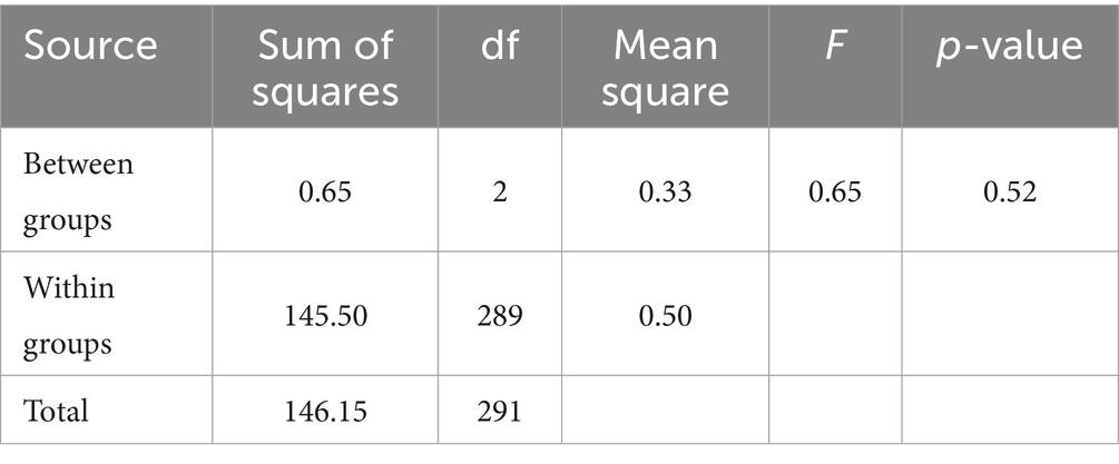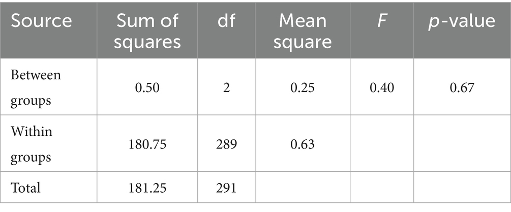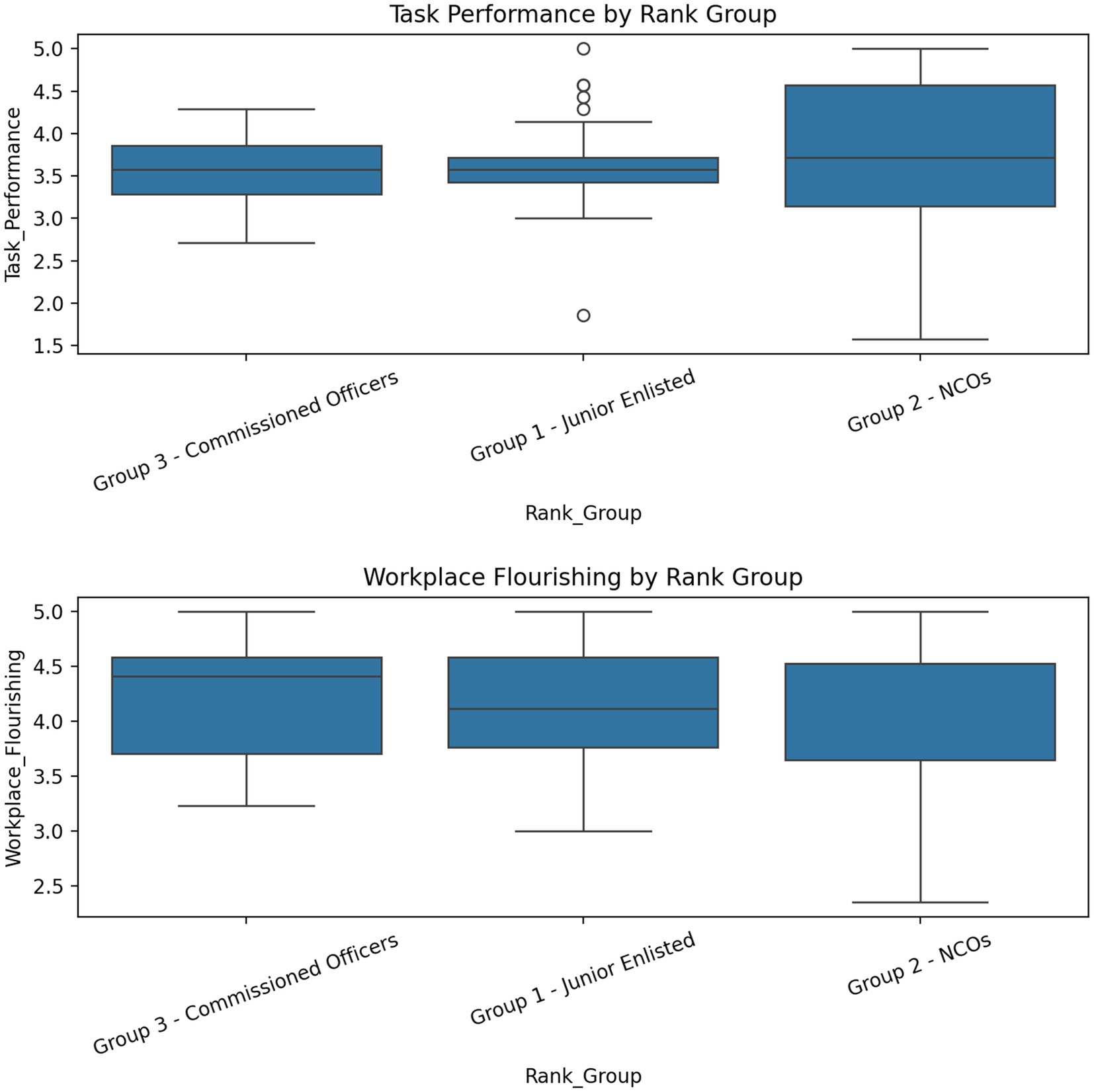 This finding implies that workplace flourishing significantly and positively predicts task performance of the Ghana Armed Forces. Therefore, H1 was accepted. The significant positive association suggests that as workplace flourishing increases, in terms of feeling happy, excitement, energy, and belongingness, they tend to be more engaged with their tasks toward a common goal (task performance increases). This implies that a supportive and fulfilling work environment can enhance the effectiveness of military personnel in their roles. This outcome emphasizes the importance of promoting a flourishing environment within military settings. When personnel experience higher levels of well-being and fulfillment at work, it can lead to improved performance on tasks critical to the military. Further analysis investigated potential differences across the military hierarchy; participants’ sample (N = 292) were grouped into three categories: Junior Enlisted (n = 137), Non-Commissioned Officers (NCOs) (n = 99), and Commissioned Officers (n = 56). A one-way analysis of variance (ANOVA) revealed no statistically significant mean differences across Rank Groups for workplace flourishing (F (2, 289) = 0.65, p = 0.52) or task performance (F (2, 289) = 0.40, p = 0.67). Each table shows that average scores do not differ significantly by rank group. This suggests that the experience of flourishing and self-reported performance levels are consistent across hierarchical levels within the Ghana Armed Forces, thus implying that the benefits of a flourishing environment are universal across these hierarchical tiers (Table 4).