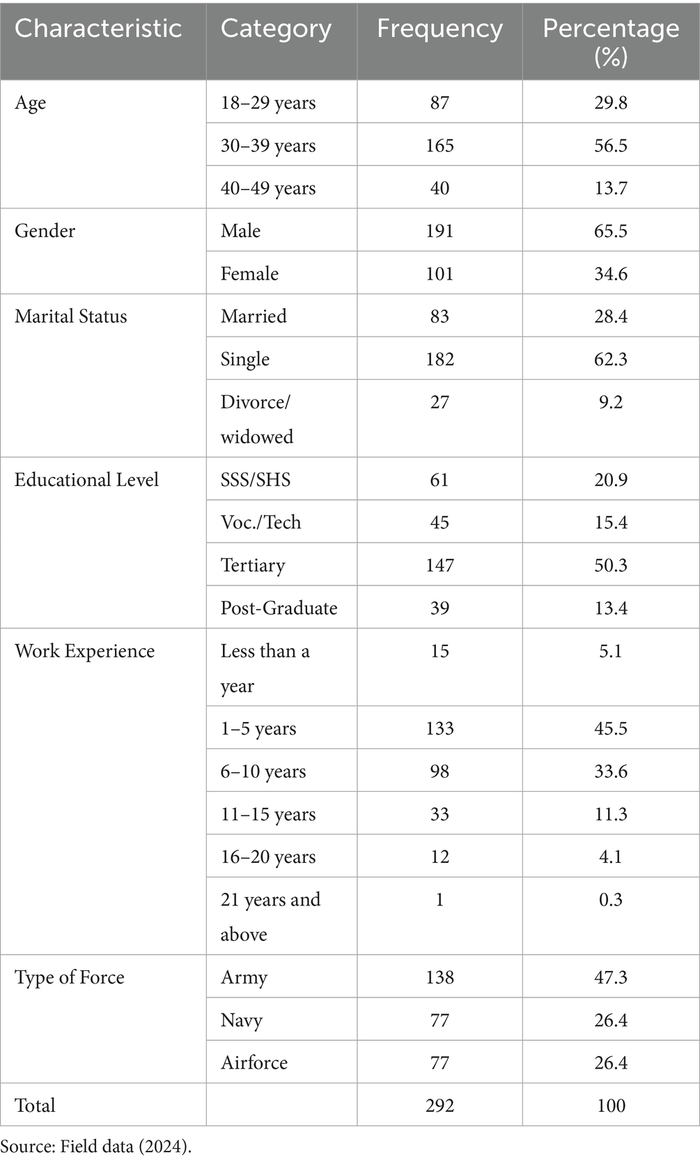 A quantitative cross-sectional design was used to measure specific characteristics within the sample and analyze information from a structured data collection process (Davis and Sandifer-Stech, 2006). For this research, the population consisted of military personnel, including Commissioned Officers and Non-Commissioned Officers (NCOs), serving in the Ghana Armed Forces (GAF), specifically those stationed at the 37 Military Hospital in the Greater Accra Region. The targeted military personnel comprised ranks ranging from Second Lieutenant (2/Lt) to Major (Maj) among Commissioned Officers, and from Warrant Officers to Privates among NCOs, including equivalents in other Arms of Service. Furthermore, the choice of facility for this research was influenced by several key factors. Firstly, the 37 Military Hospital is the largest military medical facility in Ghana, featuring a Tri-Service composition that includes personnel from the Army, Navy, and Air Force. This unique setting provided an unparalleled research environment, attracting a diverse population of military personnel, including both combat troops and support staff. Out of 619 total population, a sample size of 370 personnel was determined using Miller and Brewer’s (2003) formula. Stratified sampling technique was used to ensure adequate representation within each stratum —Army, Navy, and Air Force—within the GAF. In terms of inclusion and exclusion criteria, the study targeted personnel in the armed forces across various units and departments within the Forces. The inclusion criteria established for participants were as follows. First, participants had to be currently serving members of the Ghana Armed Forces to ensure relevance to the study context. Second, participants were required to be actively engaged in their military responsibilities within the Ghana Armed Forces during the time of data collection to capture their current experiences. Third, the study included participants from the ranks of Second Lieutenant to Major (commissioned officers) and Non-Commissioned Officers (NCOs), as well as their equivalents in other branches of service. The exclusion criteria established for the study were as follows. First, senior officers, defined as those holding ranks from Lieutenant Colonel and above, including Generals, Brigadier Generals, Commodores, Admirals, Colonels, Marshals of the Air Force, and Air Commodores, as well as their equivalents in other services, were excluded from participation. Second, non-military personnel, including civilians or individuals not directly affiliated with the Ghana Armed Forces, were also excluded. This decision aimed to maintain the homogeneity of the sample and ensure the unique military context was preserved, thereby facilitating the attainment of the research objectives.