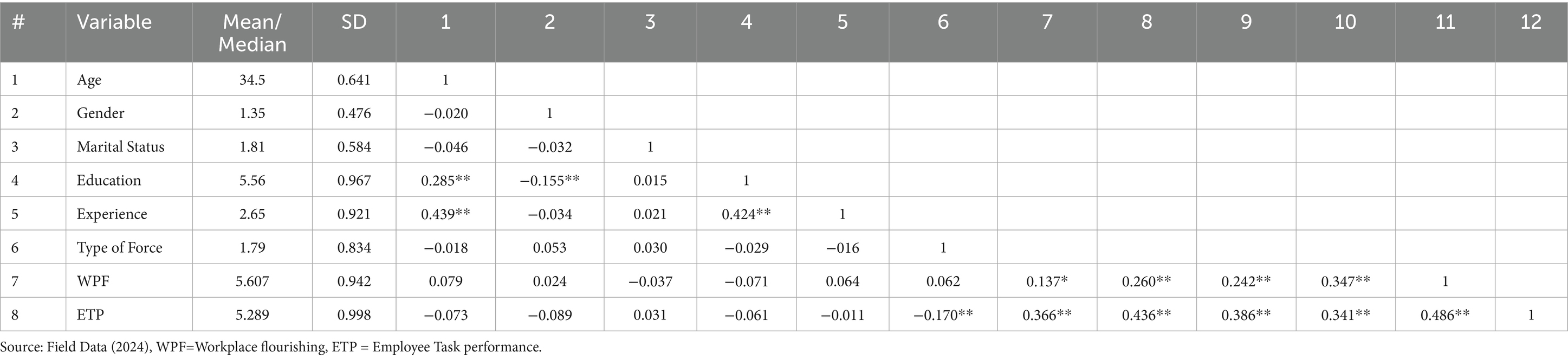The relationship between workplace flourishing and employee task performance was also found to be significant (r = 0.486, p < 0.01) (see Table 2). This strong correlation implies that employees who flourish in their work environment not only experience personal well-being but also show higher levels of job performance, underscoring the link between a positive work atmosphere and productivity. Lastly, the analysis explored the potential impact of demographic variables—such as age, gender, marital status, education, experience, and type of work setting—on workplace flourishing and employee task performance. However, the findings indicated that none of these demographic factors had a significant relationship with either workplace flourishing or employee task performance.