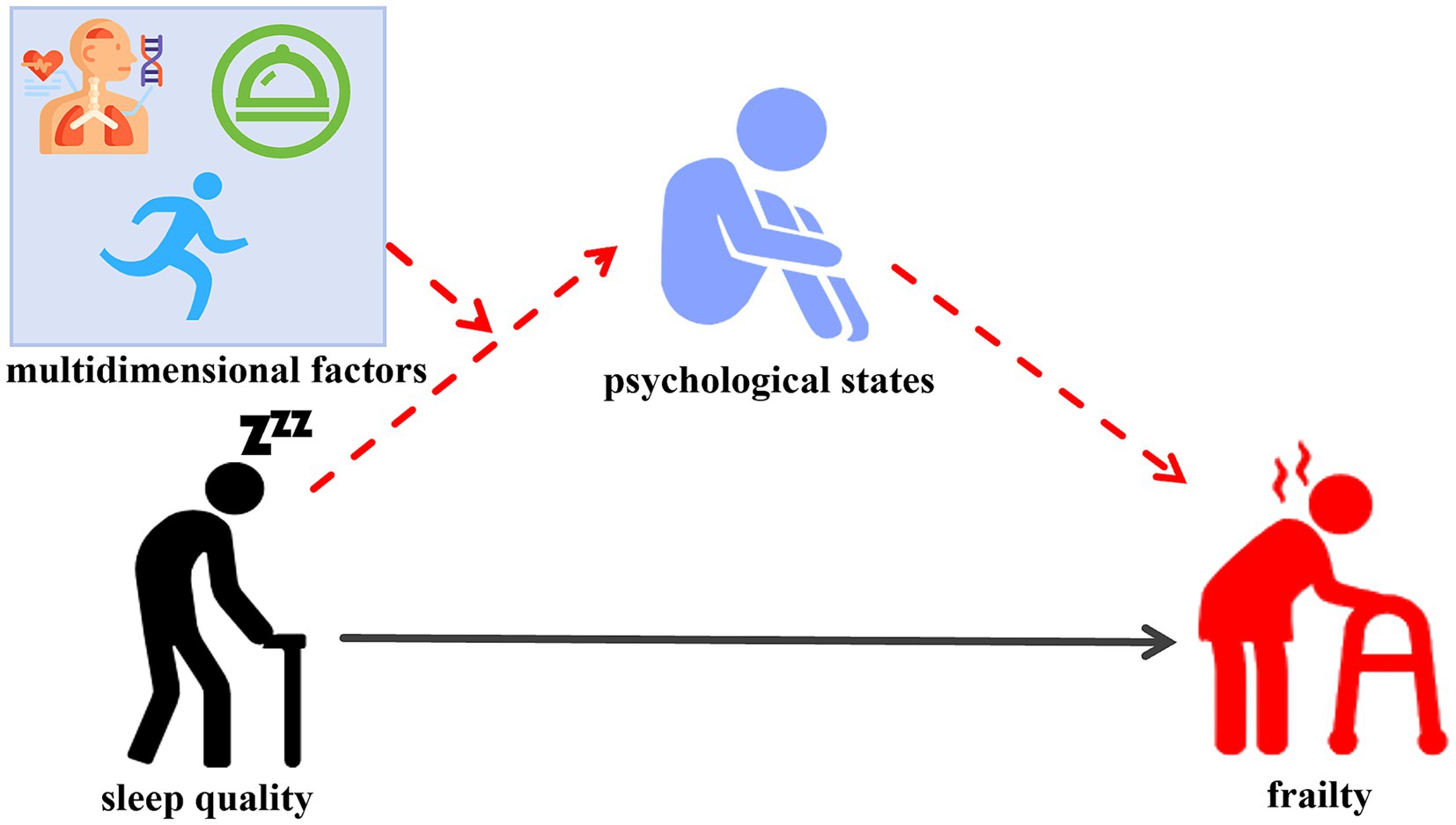 Previous studies have suggested that sleep quality is significantly associated with a debilitating state in old age (Balomenos et al., 2021; Alqahtani, 2021). Notably, sleep quality problems are prevalent in the elderly population and partly stem from difficult-to-intervene factors such as physiologic aging (Pappas and Miner, 2022). Sleep quality problems and psychological states (anxiety and depression) often coexist (Chellappa and Aeschbach, 2022; Baglioni et al., 2011), and psychological states themselves are not only important risk factors for frailty, but may also reduce the likelihood of recovery in frail older adults (Mutz et al., 2022). Previous studies have demonstrated associations among sleep quality, psychological states, and frailty. However, a critical gap remains in understanding whether psychological states, specifically anxiety and depression, serve as mediators in the relationship between sleep quality and frailty. Therefore, we propose the first hypothesis: anxiety and depression mediate the relationship between sleep quality and frailty.