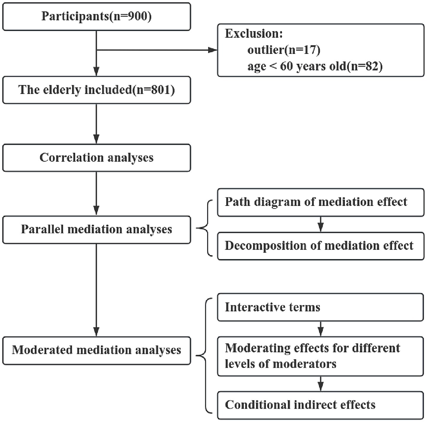 Flowchart of a research process involving 900 participants. After excluding 17 outliers and 82 under 60 years old, 801 elderly participants remain. Steps include correlation analyses, followed by parallel mediation analyses, with path diagrams and decomposition of effects. Proceeding to moderated mediation analyses involving interactive terms, moderating effects for different levels, and conditional indirect effects.