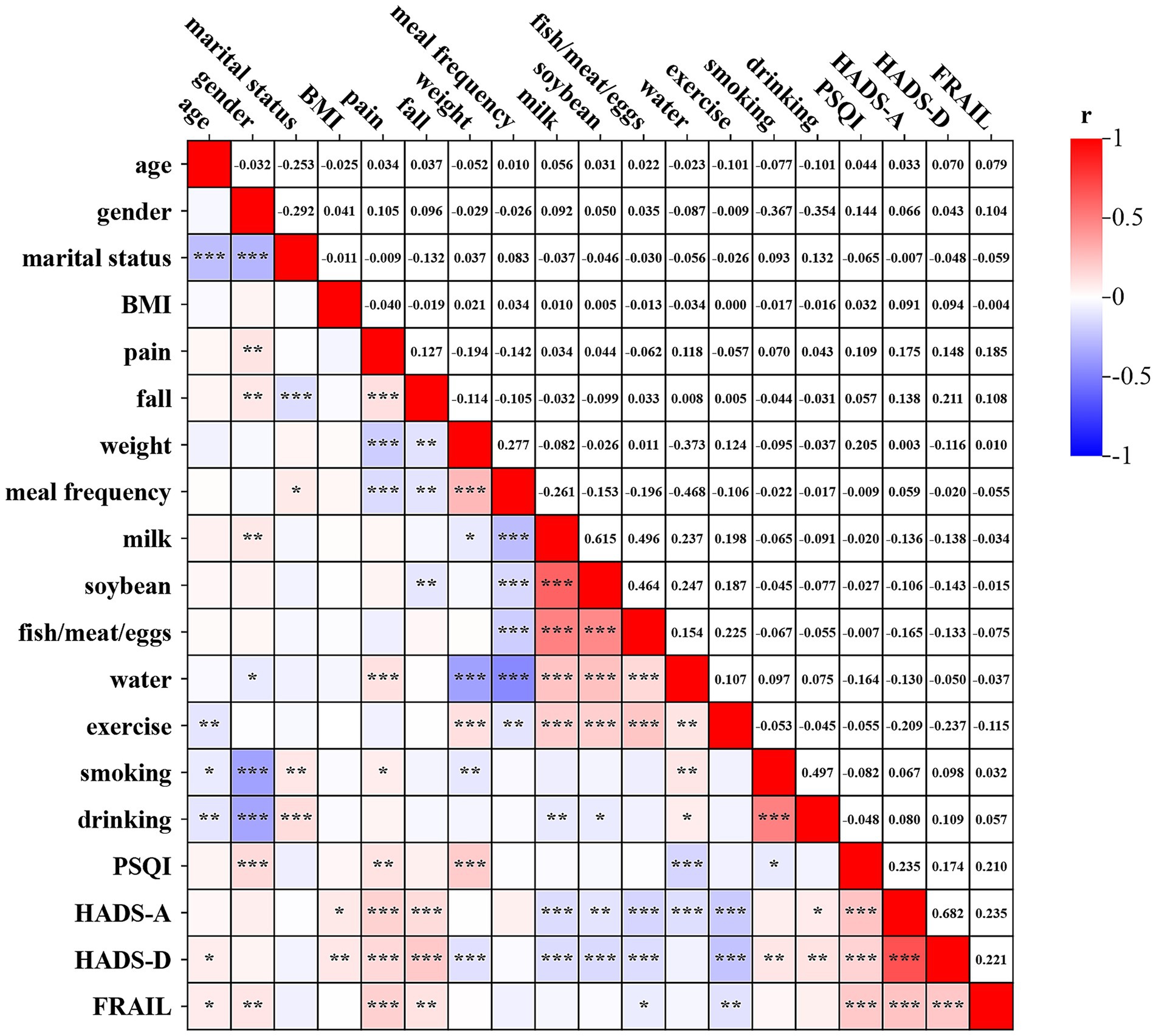 Correlation matrix displaying relationships between various factors such as age, gender, marital status, BMI, pain, dietary habits, lifestyle choices, and health indices like PSQI, HADS, and FRAIL. Positive correlations are in red, negative in blue, with intensity indicating strength. Significance is marked with asterisks.