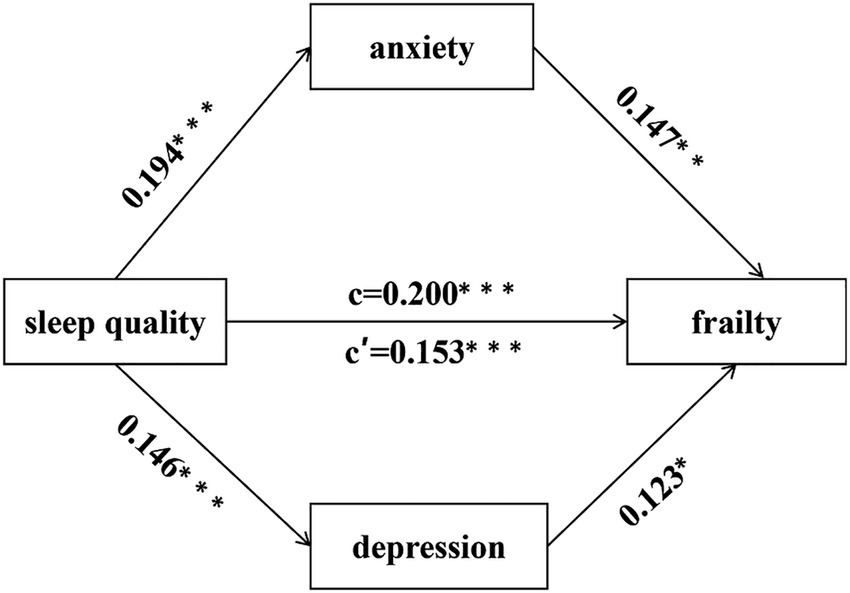Diagram illustrating relationships between sleep quality, anxiety, depression, and frailty. Arrows indicate directional influences with associated coefficients: sleep quality to anxiety (0.194), anxiety to frailty (0.147), sleep quality to depression (0.146), depression to frailty (0.123), sleep quality to frailty (c=0.200, c’=0.153). Asterisks signify statistical significance.