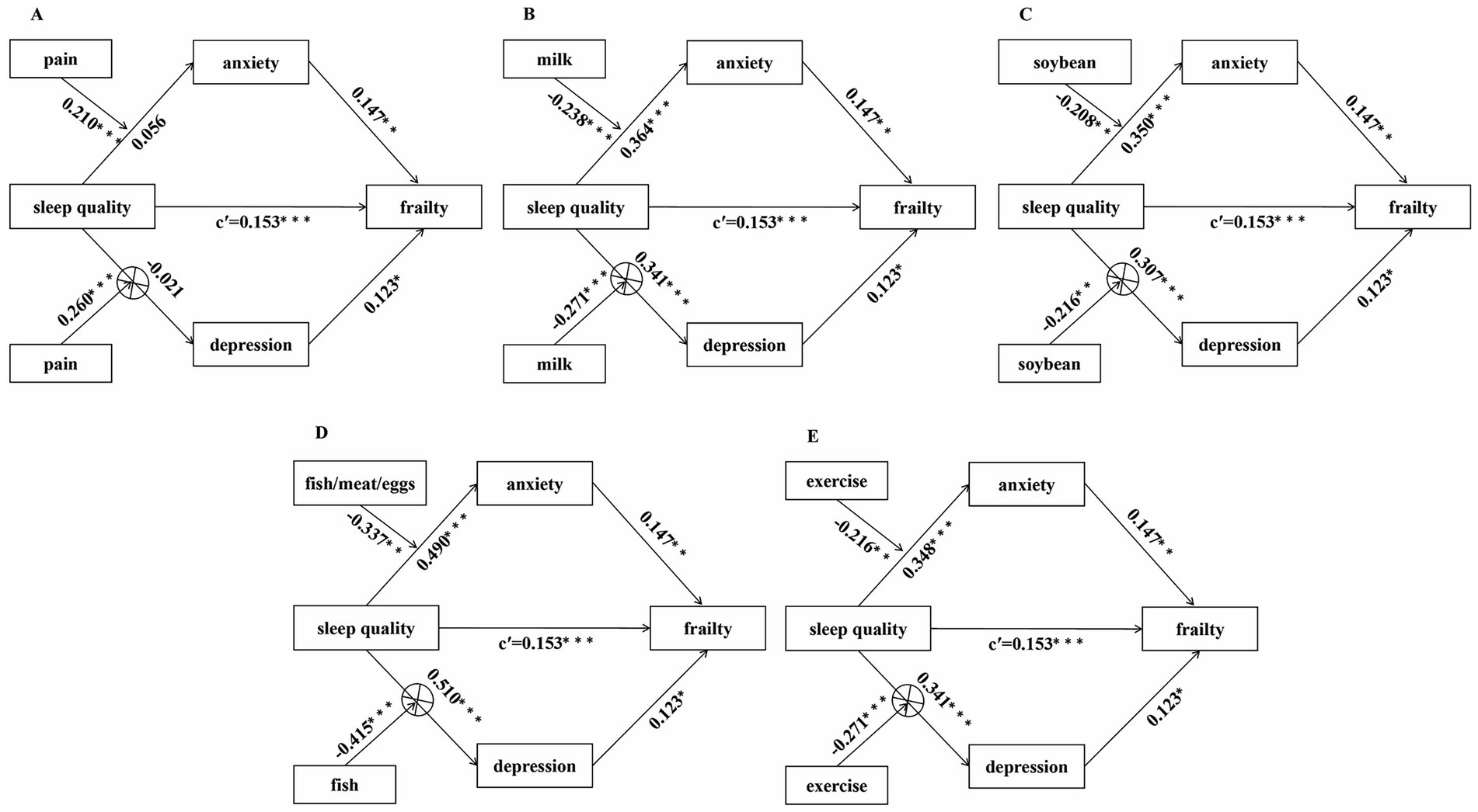 Five path diagrams labeled A to E depict relationships among variables: anxiety, depression, frailty, sleep quality, and specific dietary or lifestyle factors like pain, milk, soybean, fish/meat/eggs, and exercise. Each diagram includes arrows showing the direction and strength of relationships between variables with significance levels marked by asterisks. Key pathways include anxiety and depression affecting frailty through sleep quality. Decorative elements include mediated paths marked with circles and indicated coefficients.