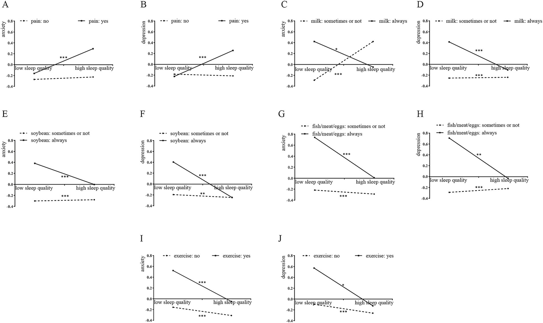 Figure 6. The simple slope plots with the multidimensional factors as a moderator. (A) Whether bodily pains act as a moderator of the connection between sleep quality and anxiety; (B) whether bodily pains acts as a moderator of the connection between sleep quality and depression; (C) intake of milk five times per week acts as a moderator of the connection between sleep quality and anxiety; (D) intake of milk five times per week acts as a moderator of the connection between sleep quality and depression; (E) intake of soybean five times per week acts as a moderator of the connection between sleep quality and anxiety; (F) intake of soybean five times per week acts as a moderator of the connection between sleep quality and depression; (G) intake of fish/meat/eggs five times per week acts as a moderator of the connection between sleep quality and anxiety; (H) intake of fish/meat/eggs five times per week acts as a moderator of the connection between sleep quality and depression; (I) whether doing outdoor exercise for at least 30 min daily acts as a moderator of the connection between sleep quality and anxiety; (J) whether doing outdoor exercise for at least 30 min daily acts as a moderator of the connection between sleep quality and depression. Low sleep quality means one standard deviation below the mean of sleep quality; high sleep quality means one standard deviation above the mean of sleep quality. *p < 0.05; **p < 0.01; ***p < 0.001.
