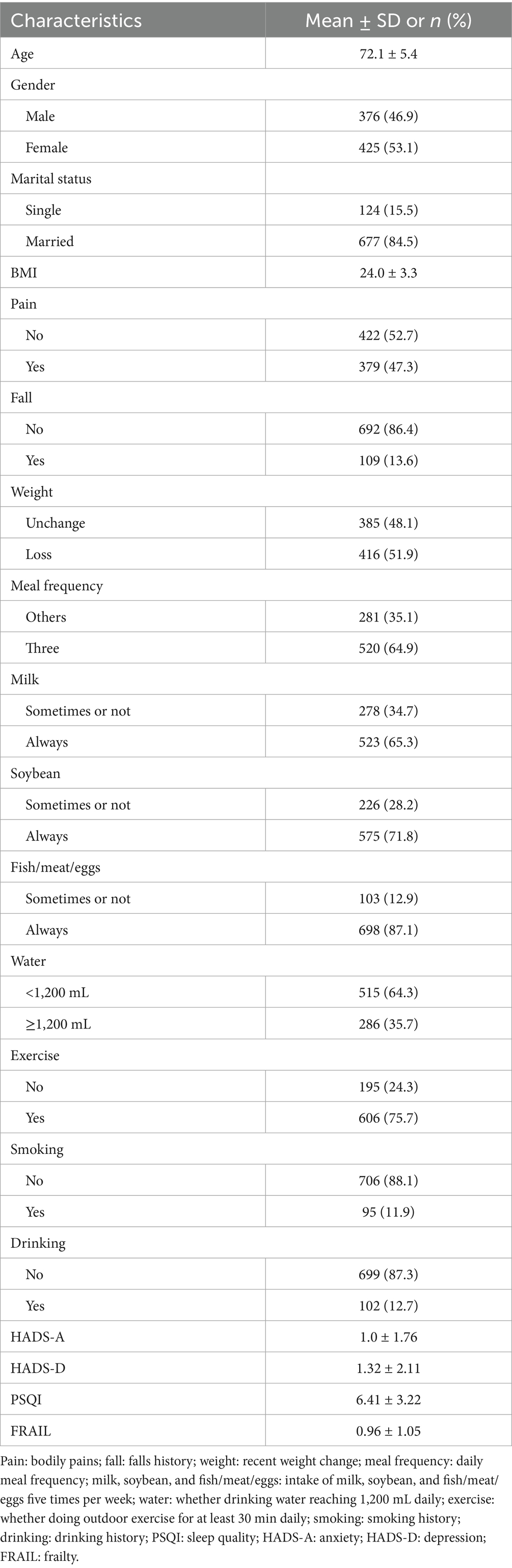 Self-report questionnaires were administered to 900 participants recruited via random sampling. Finally, a sample of 801 participants was included in this study. Exclusions were due to univariate outliers (n = 17) and age under 60 years (n = 82) (Figure 2). The mean age of the 801 participants was 72.1 ± 5.4 years. Among these participants, 376 (46.9%) were male and 677 (84.5%) were married. The majority of participants reported no bodily pain (52.7%), no fall history (86.4%), loss of weight (51.9%), and eating three times a day (64.9%). Most of the participants were able to intake milk (65.3%), soybean (71.8%), and fish/meat/eggs (87.1%) at least five times per week. 606 (75.7%) participants did outdoor exercise for at least 30 min daily, and 286 (35.7%) participants drank water ≥1,200 mL daily. Most participants had no history of smoking (88.1%) and drinking (87.3%). The average scores for HADS-A, HADS-D, PSQI, and FRAIL were 1.00 + 1.76, 1.32 ± 2.11, 6.41 ± 3.22, and 0.96 ± 1.05, respectively. The other relevant information is shown in Table 1.