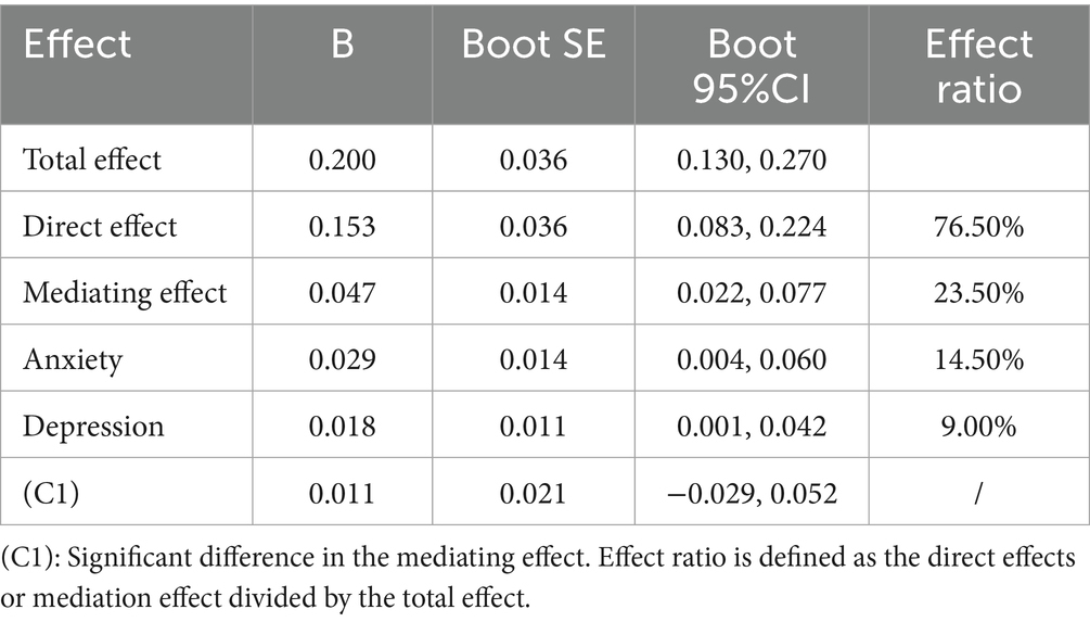 After adjusting for age, gender, and marital status, mediation effects were tested using Model 4 with sleep quality as the independent variable, frailty as the dependent variable, and anxiety and depression as the mediating variables. The results showed that sleep quality was a significant positive predictor of frailty (B = 0.200, p < 0.001) (Figure 4). The direct effect of sleep quality on frailty remained significant after adding the mediating variables (B = 0.153, p < 0.001) (Figure 4). Mediation analyses showed significant indirect effects for both anxiety (B = 0.029, 95%CI [0.004, 0.060]) and depression (B = 0.018, 95%CI [0.001, 0.042]) (Table 2). The total effect could be decomposed into a direct effect (B = 0.153, 95%CI [0.083, 0.224]) and a total indirect effect (B = 0.047, 95%CI [0.022, 0.077]), accounting for 76.50 and 23.50% of the total effect, respectively. The mediating effect of anxiety accounted for 14.50% of the total effect and the mediating effect of depression accounted for 9.00% of the total effect. However, the difference in the amount of indirect effects for anxiety and depression was not statistically significant (B = 0.011, 95%CI [− 0.029, 0.053]) (Table 2).