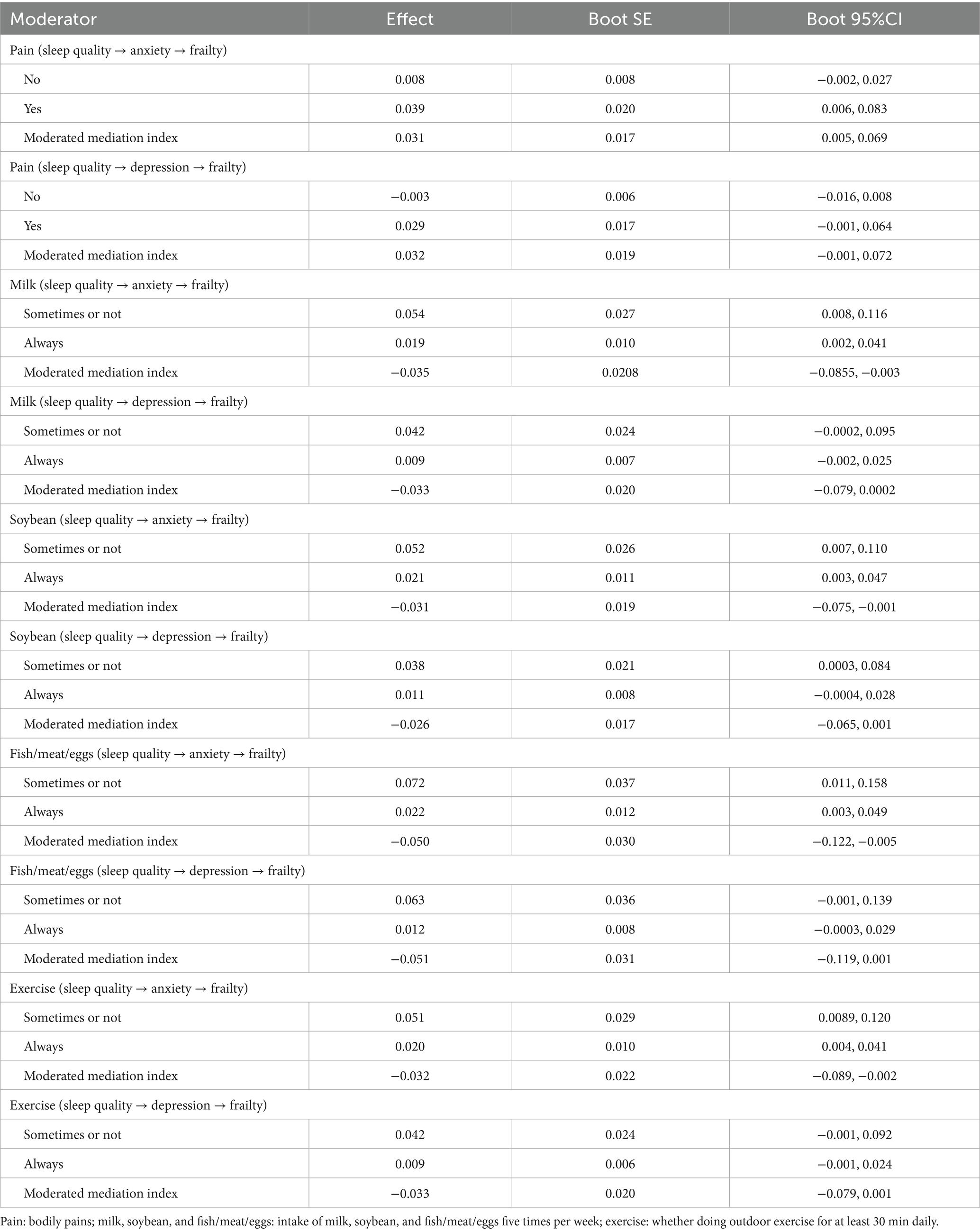Furthermore, analyses of conditional indirect effects showed (Table 3) that the mediating effects of anxiety on the association between sleep quality and frailty was positively moderated by whether there have been bodily pains over the past years (B = 0.031, Boot 95%CI [0.005, 0.069]), and negatively moderated by the intake of milk (B = −0.035, Boot 95%CI [−0.0855, −0.003]), soybean, and fish/meat/eggs five times per week (B = −0.031, Boot 95%CI [−0.075, −0.001]), and whether doing outdoor exercise for at least 30 min daily (B = −0.050, Boot 95%CI [−0.122, −0.005]). Specifically, when there has been pain in any part of the body over the past years, the conditional indirect effect of anxiety (B = 0.039, Boot 95%CI [0.006, 0.083]) was statistically significant. When older adults could not or occasionally could not intake milk (B = 0.054, Boot 95%CI [0.008, 0.116]), soybean (B = 0.052, Boot 95%CI [0.007, 0.110]), or fish/poultry/eggs (B = 0.072, Boot 95%CI [0.011, 0.158]) to reach five times per week, or when older adults could not do outdoor exercise for at least 30 min daily (B = 0.051, Boot 95%CI [0.0089, 0.120]), the conditional indirect effect of anxiety was statistically significant. When older adults intake milk(B = 0.019, Boot 95%CI [0.002, 0.041]), soybean (B = 0.021, Boot 95%CI [0.003, 0.047]), or fish/poultry/eggs (B = 0.022, Boot95% CI [0.003, 0.049]) to reach five times per week, or did outdoor exercise for at least 30 min daily (B = 0.020, Boot 95%CI = [0.004, 0.041]), the conditional indirect effect of anxiety were still significant but diminished. However, these same moderators failed to demonstrate significant moderating effects on the mediating effect of depression. Furthermore, no significant moderated mediating effects were observed for BMI, fall history, recent weight change, daily meal frequency, whether drinking water reached 1,200 mL daily, smoking history, and drinking history (Supplementary Table S2).