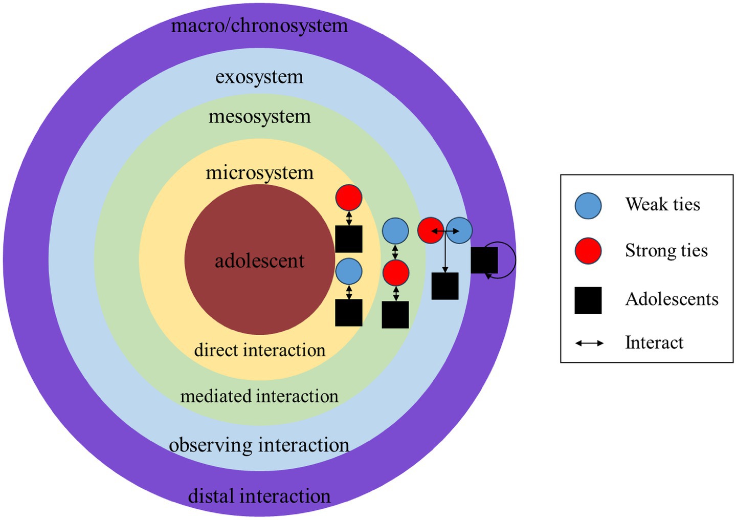 Parents, teachers, and classmates interact directly with adolescents in family and school settings, and they are the major social actors in the microsystem. However, prior research focused on students’ interactions with strong ties, ignoring peers, neighbors, kinsmen, or netizens. Moreover, the research explored whether students’ interactions with weak ties trigger AS.
