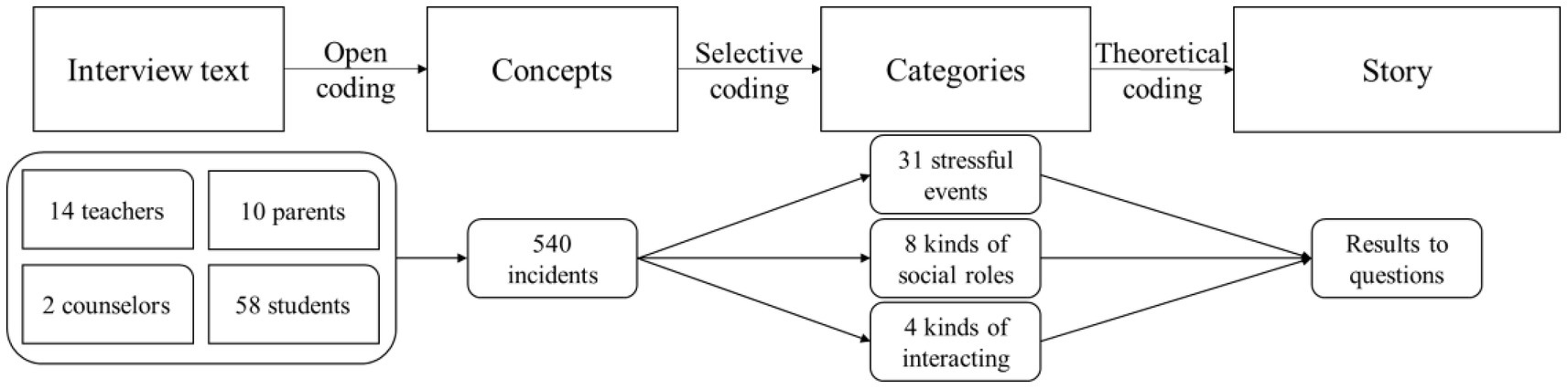 Flowchart depicting a research process from interview text to story. Interview text involves 14 teachers, 10 parents, 2 counselors, and 58 students, leading to 540 incidents. This undergoes open coding to create concepts, selective coding to form categories, and theoretical coding to derive a story. Categories include 31 stressful events, 8 kinds of social roles, and 4 kinds of interacting, resulting in answers to questions.