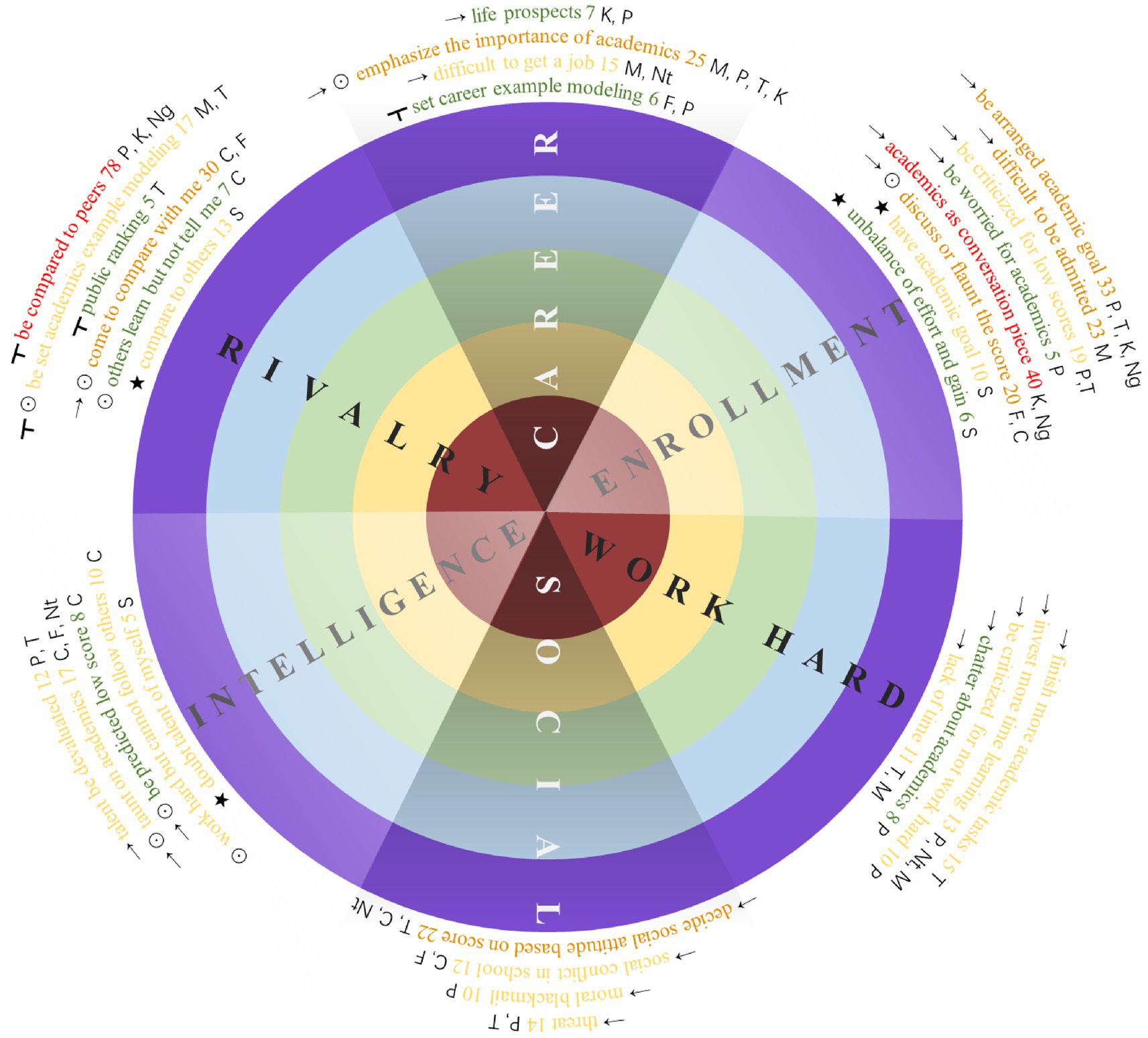 The culture, laws, and educational institutions shape the social mainstream’s views on students’ academic achievements (Foucault, 1975). The majority of citizens recognize the mainstream ideas to some extent, acting as a voice in the chorus of mainstream ideas. Students stay in the chorus for a long time and finally internalize the norms, believing that the AS comes from their own expectations and needs. When students feel stressed without any external stimuli, the so-called self-stress is a mirror of the long-term discipline of mainstream ideas, i.e., the combination of macrosystem and chronosystem. It is challenging to determine the details and sources of mainstream ideas underlying self-stress; however, the existence of self-stress reflects the influence of both the macrosystem and the chronosystem. Thus, self-stress is referred to as distal interaction and is used as a category in data processing.