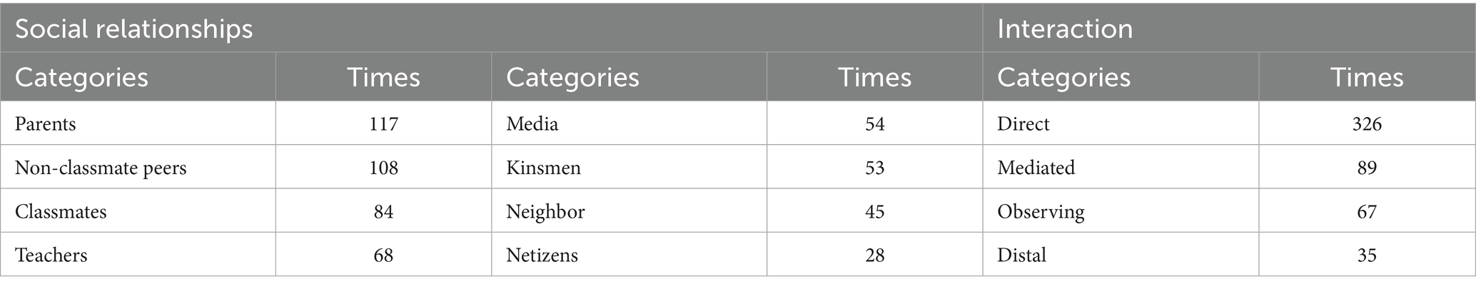 According to the literature, the interaction between strong ties and weak ties can trigger students’ AS, and the SAE would be attributed to the actor who directly interacts with students. For example, the SAE of “parents’ opposing children’s playing with classmates with low academic achievements, triggering their social conflicts with their classmates” is attributed to classmates (Rao, 2008). However, conflicts among students may reflect the interaction in the mesosystem, which means that the role of parents cannot be neglected. From the perspective of ecological systems theory, both parents and classmates would be considered related social actors in the mesosystem. Such interaction ways, which involve more than one social actor, are distinguished from direct interaction in the microsystem and serve as a category in data processing. It is called “mediated interaction,” which refers to the phenomenon that a third party triggers adolescents’ AS by influencing someone’s interaction with adolescents. The mediated interaction occurs within the mesosystem.